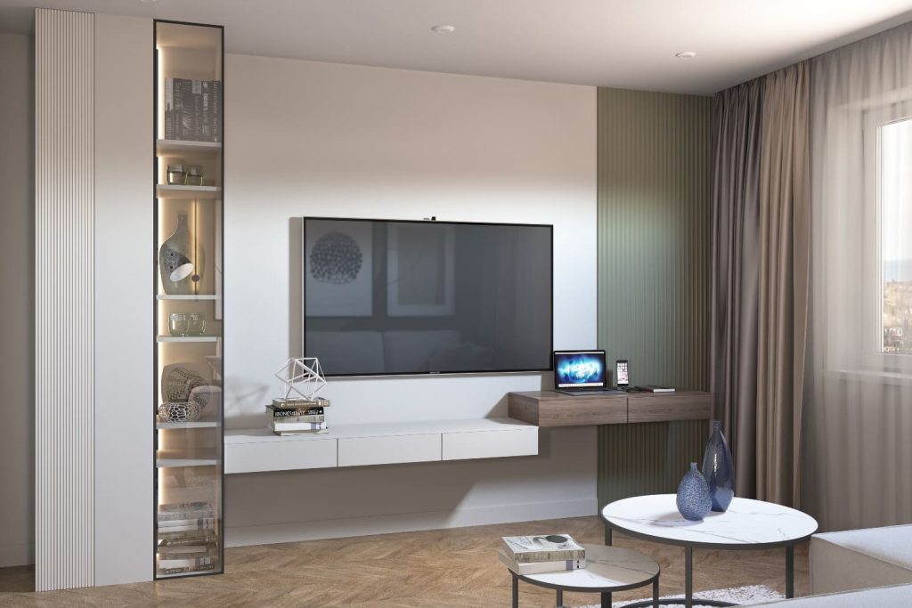 Телевизионная зона оформлена лаконично и стильно: подвесной модуль в белом цвете зрительно облегчает пространство, а компактное рабочее место с деревянной столешницей создаёт дополнительный функционал. Открытый стеллаж с подсветкой добавляет динамику интерьеру и позволяет разместить декор или книги.