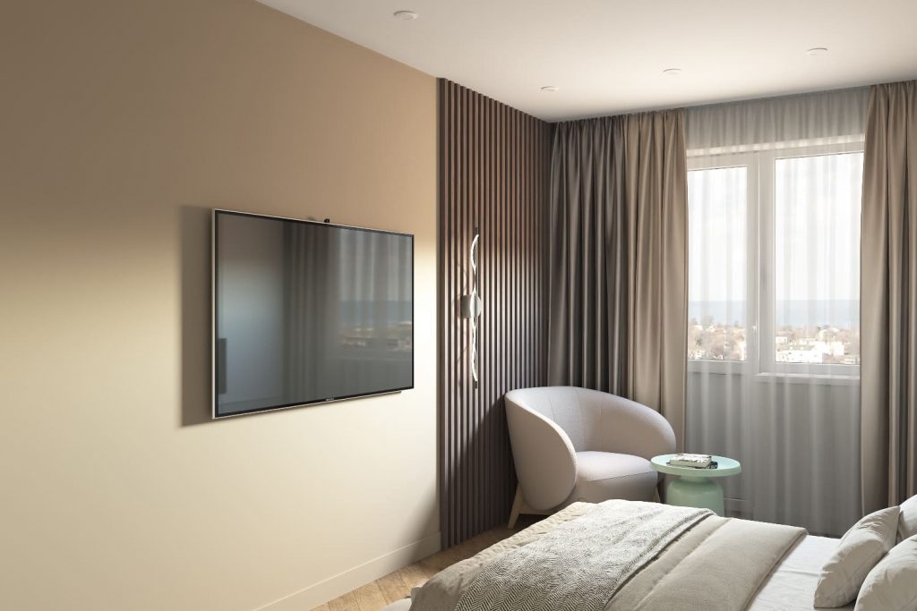Точечные светильники у изголовья кровати обеспечивают комфортное освещение для чтения, а современный настенный бра на деревянных рейках у телевизора добавляет пространству мягкого рассеянного света.