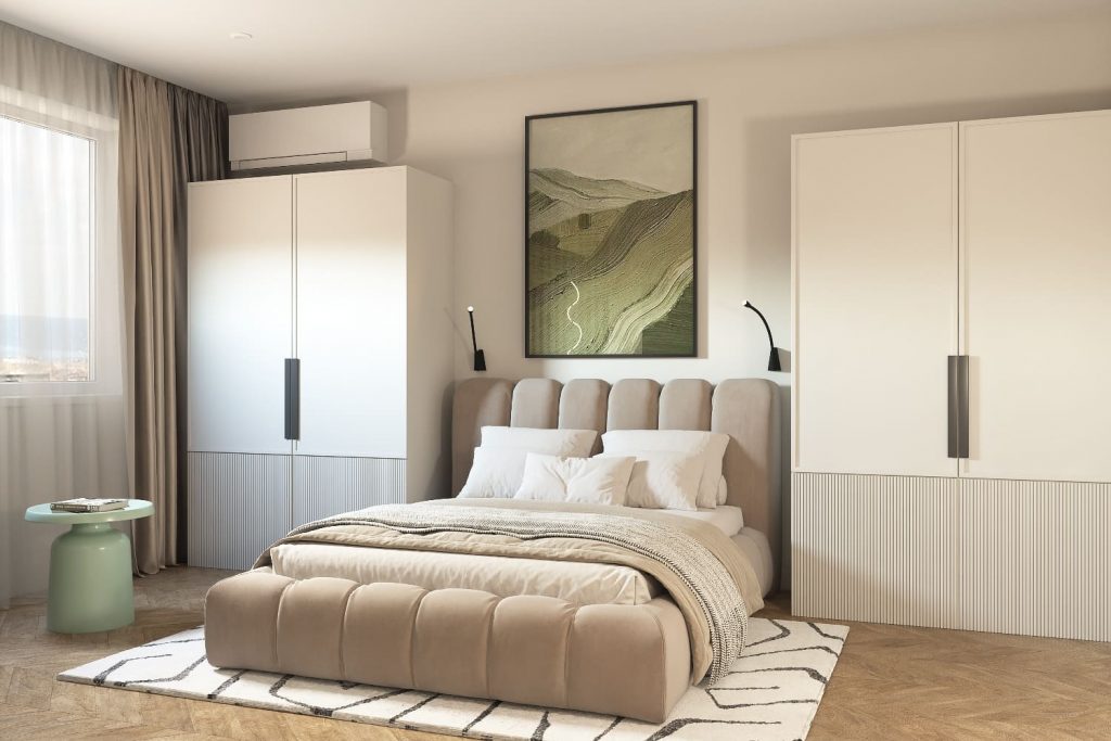 Композиция спальни строится на симметрии: два встроенных шкафа по бокам кровати обеспечивают достаточное количество хранения, при этом не загромождая пространство. Их фасады сочетают гладкие и рифлёные текстуры, что делает мебель стильной, но не перегруженной деталями.
