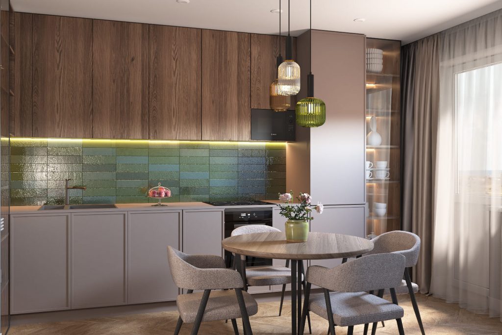 Фартук из глянцевой плитки в оттенках зелени добавляет интерьеру динамики и глубины, напоминая о природе. Вечернее освещение подчёркивает текстуру плитки, создавая игру бликов. Открытые полки с подсветкой не только украшают пространство, но и делают его более живым, а прозрачные вставки в шкафах визуально облегчают композицию.