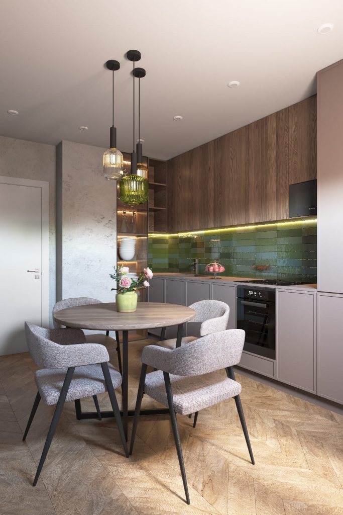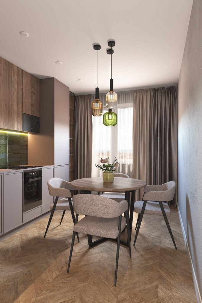 Круглый стол из натурального дерева поддерживает общую концепцию сдержанного уюта, а мягкие кресла на тонких металлических ножках выглядят современно и не загромождают пространство. Над столом — композиция из подвесных светильников с рифлёными стеклянными плафонами в золотистом, зелёном и прозрачном оттенках. Они добавляют интерьеру изюминку, но при этом не выбиваются из общей гаммы.