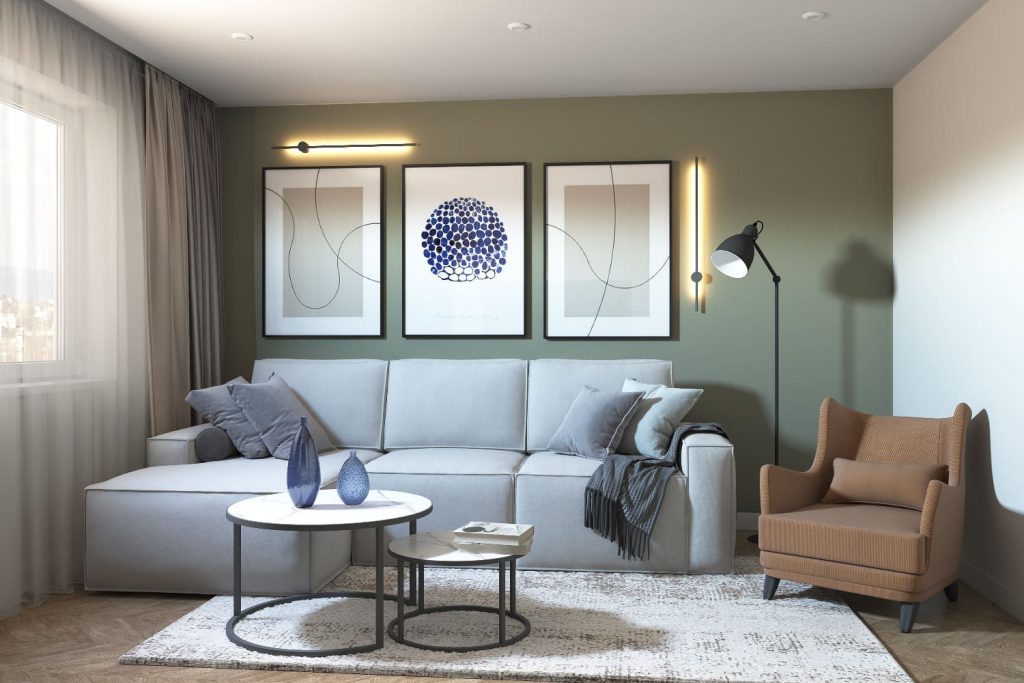 Базовая палитра выстроена на спокойных природных оттенках: мягкий серый диван гармонично сочетается с приглушённой оливковой стеной, создавая расслабляющую атмосферу. Тёплый акцент добавляет уютное кресло оттенка карамели, которое смягчает общий минималистичный облик.