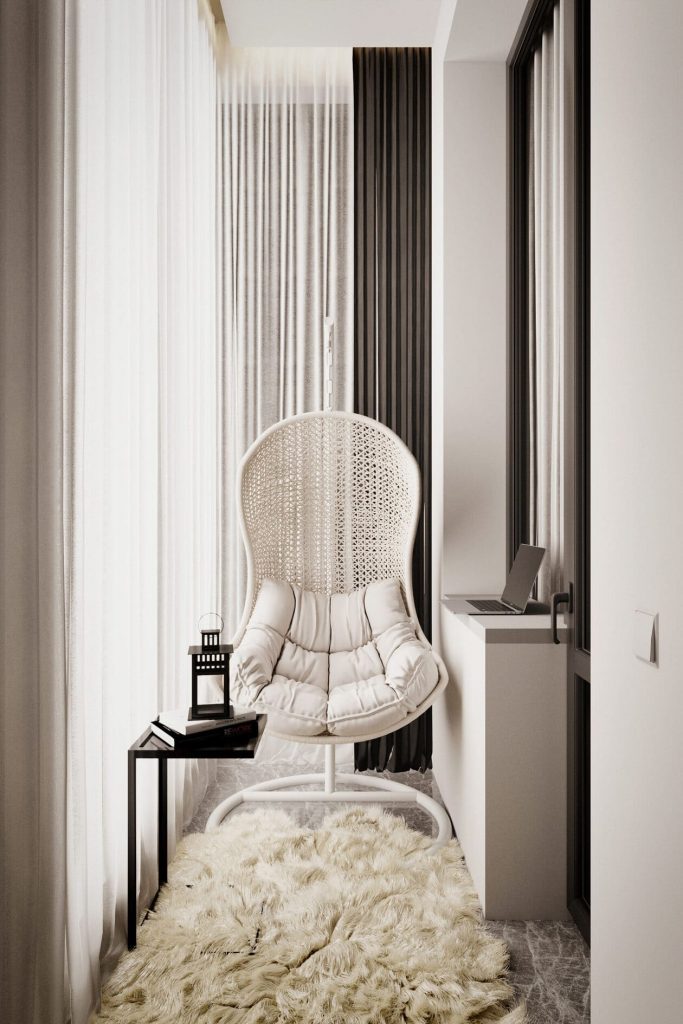 Ключевой акцент — подвесное кресло. Оно как будто парит в пространстве, повторяя изгибы стены и мягко вписываясь в светлую палитру интерьера. Под ним — пушистая овечья шкура, добавляющая тактильный комфорт и домашнее тепло.