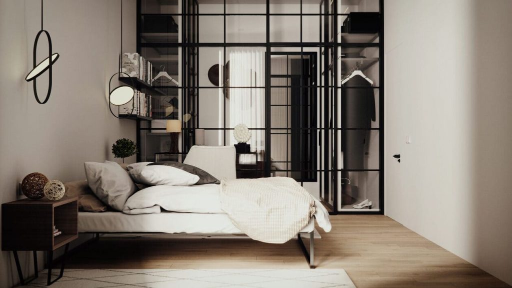 По просьбе хозяйки мы разделили помещение на две функциональные зоны: саму спальню и гардеробную. Границу между ними задала остеклённая перегородка в стиле лофт — лёгкая, но выразительная. Благодаря стеклу гардероб не «давит» и не крадёт свет, а наоборот — визуально расширяет пространство.