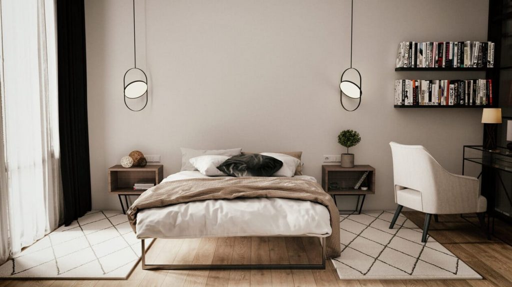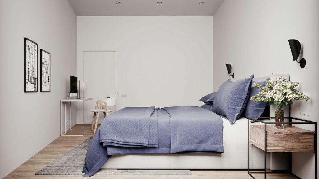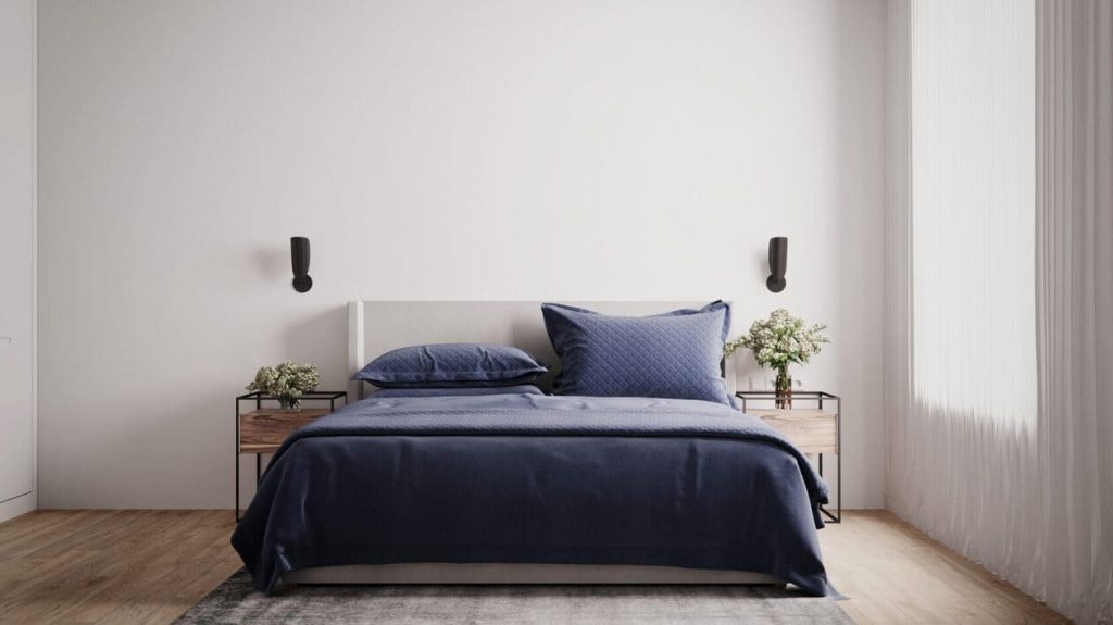 Цветовая палитра — светлая, спокойная, с акцентом на глубокий синий текстиль, который добавляет характер. Лаконичные прикроватные тумбы с деревянной текстурой и металлическим каркасом вносят лёгкую индустриальную ноту, а свежие цветы делают обстановку более живой.