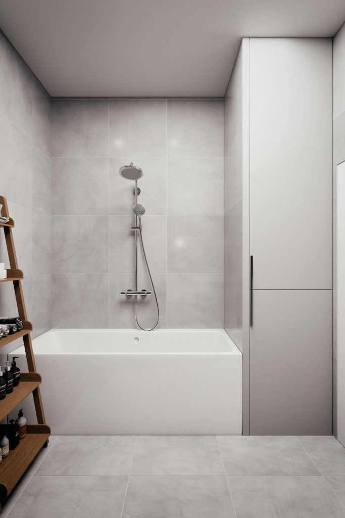 Монохромная палитра перекликается с основной ванной, создавая ощущение цельности интерьера. Душевая зона оформлена стеклянной перегородкой — это сохраняет ощущение открытого пространства и не загромождает помещение.
