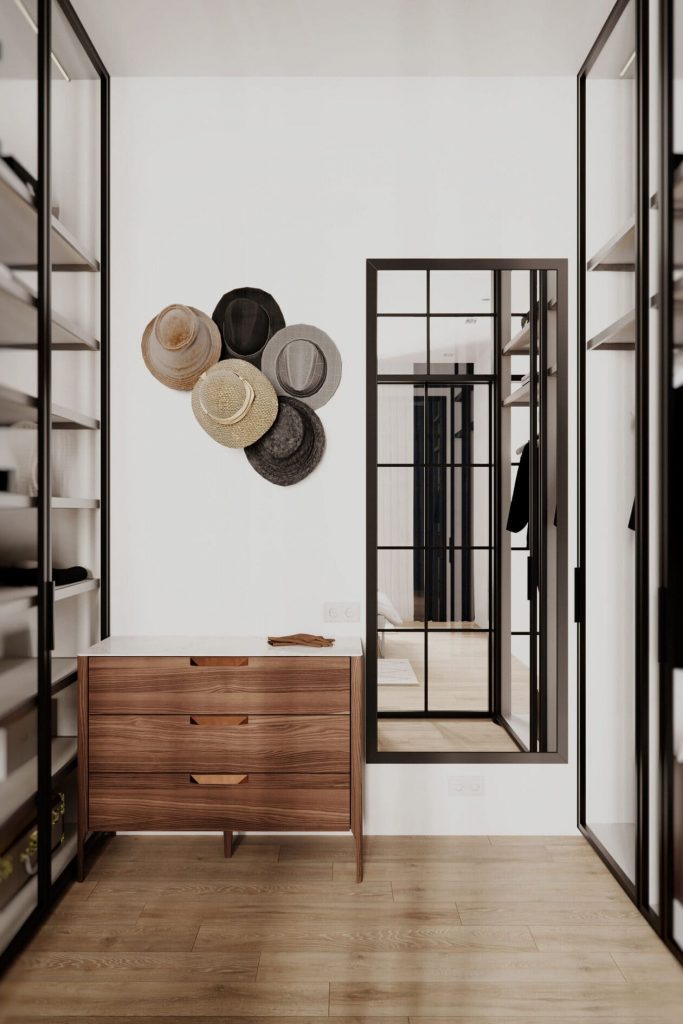 Гардеробная — мечта любой хозяйки. Открытые секции, много места для хранения, зеркало в рост и отдельный комод с текстурой дерева, который вносит уют и теплоту.