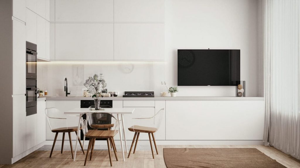 Кухня — словно растворяется в интерьере. Белые фасады без ручек, встроенная техника и лаконичная подсветка создают аккуратный, «невидимый» объём, который переходит в тумбу под ТВ. Всё — в одной линии, всё на своём месте. Ничего лишнего — именно так и задумывалось.