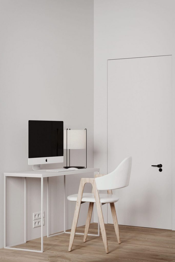 У окна — небольшое рабочее место с тонким белым столом и минималистичным стулом. Всё просто, но достаточно для того, чтобы спокойно поработать или воспользоваться зоной как туалетным столиком.