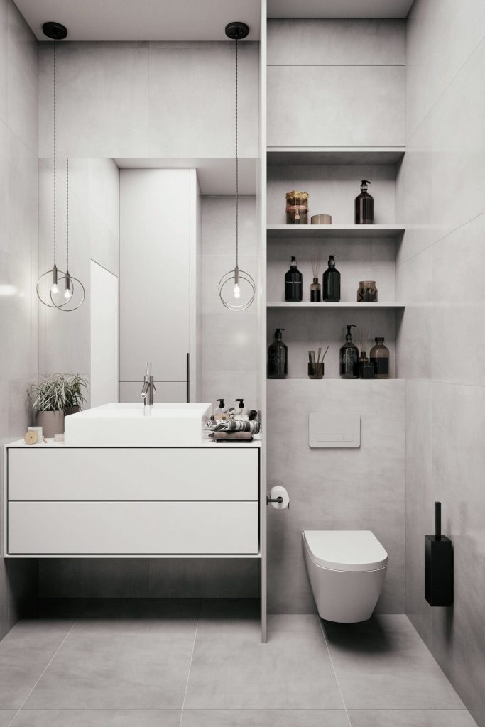 Подвесной унитаз и лаконичная мебель без лишних деталей подчёркивают чистоту линий. Белая тумба словно парит в воздухе — лёгкость и порядок в одном решении.