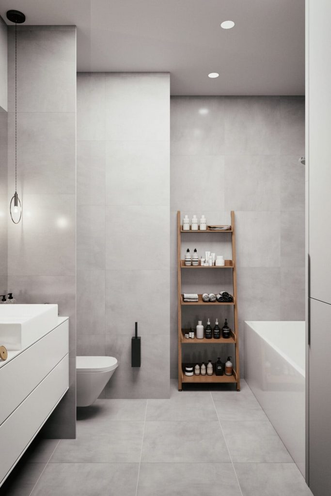 Встроенная ниша с открытыми полками сразу решает вопрос хранения — теперь всё под рукой и на своём месте. Высокий шкаф у ванны скрывает стиральную машину и все хозяйственные мелочи, благодаря чему сама зона купания остаётся чистой и аккуратной. Лаконичная тумба с умывальником дополнена двумя подвесными светильниками — они создают мягкий, расслабляющий свет, особенно приятный в вечернее время. Белые фасады мебели не выбиваются из общей цветовой гаммы, а парящая конструкция тумбы делает интерьер легче. Вместо стандартной этажерки — деревянная лестница-стеллаж: не только удобно, но и добавляет интерьеру тепла, перекликаясь с другими элементами квартиры.