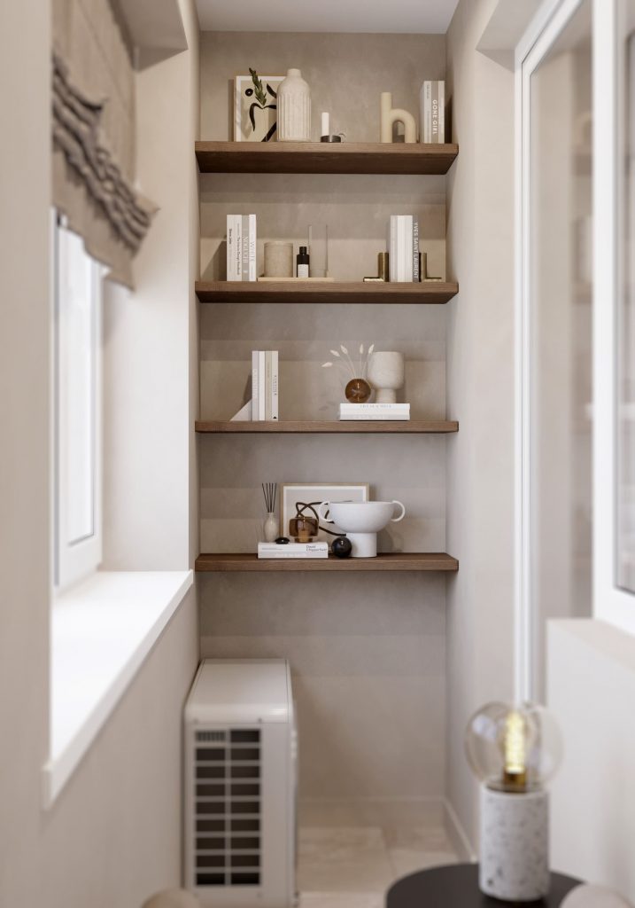 Кроме того, на балконе установлены стеллажи, которые можно использовать для хранения вещей. Здесь можно разместить книги, растения, фотографии или любые другие предметы, которые хочется сохранить в порядке и доступности.