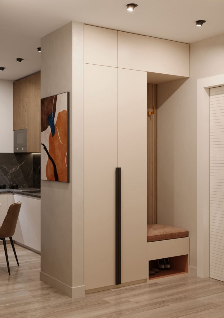 Прихожая - очень компактная, минималистичная и эргономичная. Здесь - лишь встроенная вешалка-сиденье-обувница с открытым нижним отделением для обуви, сидением с мягкой акцентной терракотовой сидушкой и панелью-вешалкой с крючками; вплотную к ней - встроенный гардеробный шкаф до потолка с антресолями; напротив них - ростовое зеркало от пола до потолка с подсветкой с подвесной консолью для ключей.