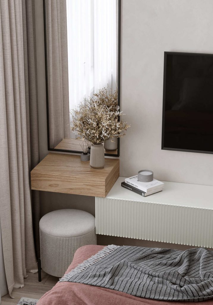 В отличие от остальных помещений квартиры, спальня выполнена без акцентов, в светлых оттенках, чтобы ничего не мешало отдыху и умиротворению. Здесь - большая удобная кровать, прикроватный столик в таком же стиле, как кофейный столик в кухне-гостиной; напротив - ТВ панель с узкой подвесной ТВ тумбой, компактная бьюти-зона, подвесной столик-консоль которой одной из сторон заходит на ТВ тумбу, под ним - место для компактного цилиндрической формы пуфа, а над ним - длинное зеркало до потолка, по другую сторону от ТВ тумбы - еще одно зеркало от пола до потолка в таком же стиле. Еще здесь размещен большой гардеробный шкаф от пола до потолка.