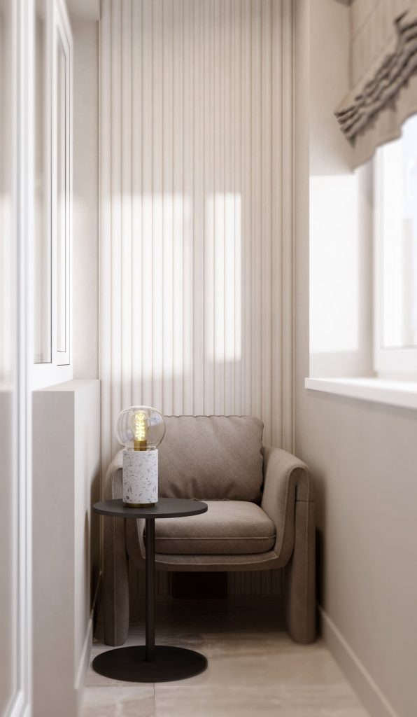 На балконе обустроена зона отдыха, где заказчица сможет расслабиться после трудного дня или провести время с близкими. Мягкое кресло станет отличным местом для чтения книги, работы на ноутбуке или просто созерцания окружающего пейзажа.