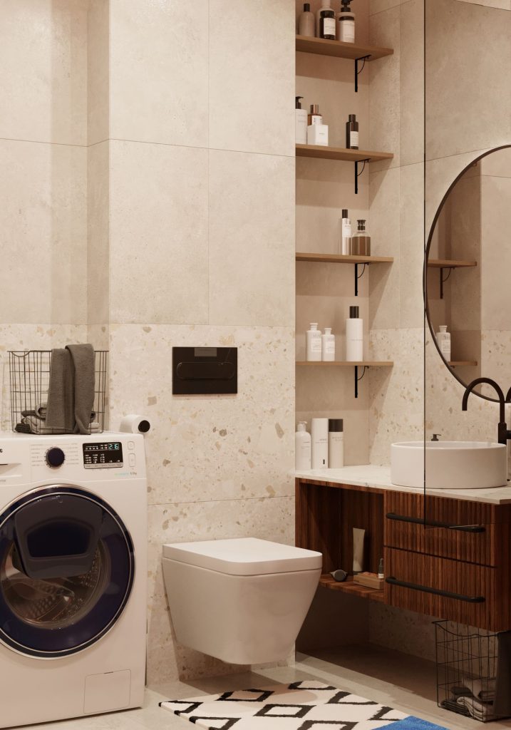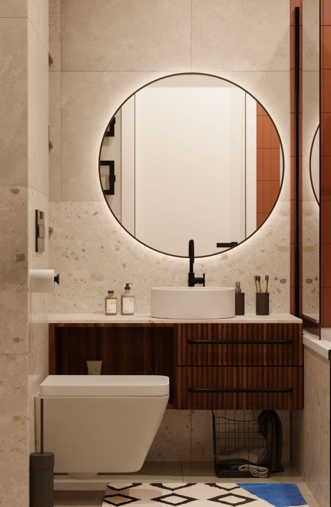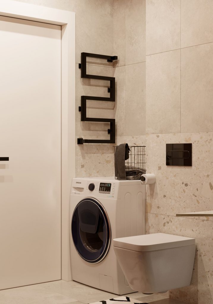 В ванной размещены: ванна, раковина-чаша с подвесной тумбой с двумя выдвижными ящиками и открытым отделением, над ней - огромное круглое зеркало, которое визуально увеличивает пространство; стиральная машина, добавленная по просьбе заказчицы; подвесной унитаз. Система хранения здесь - открытые полочки над ванной и встроенные в нишу полки слева от подвесной тумбы. Также, здесь размещен зигзагообразный полотенцесушитель.