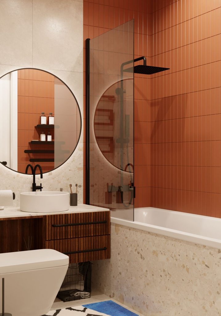 Ванная - противоположность умиротворенной, спокойной спальне, ведь здесь присутствуют яркие оттенки (терракотовая плитка на стенах над ванной), способствующие пробуждению утром. Сочетание мелкой плитки с керамогранитом создают контраст, помогающий придать пластичность и объем помещению.