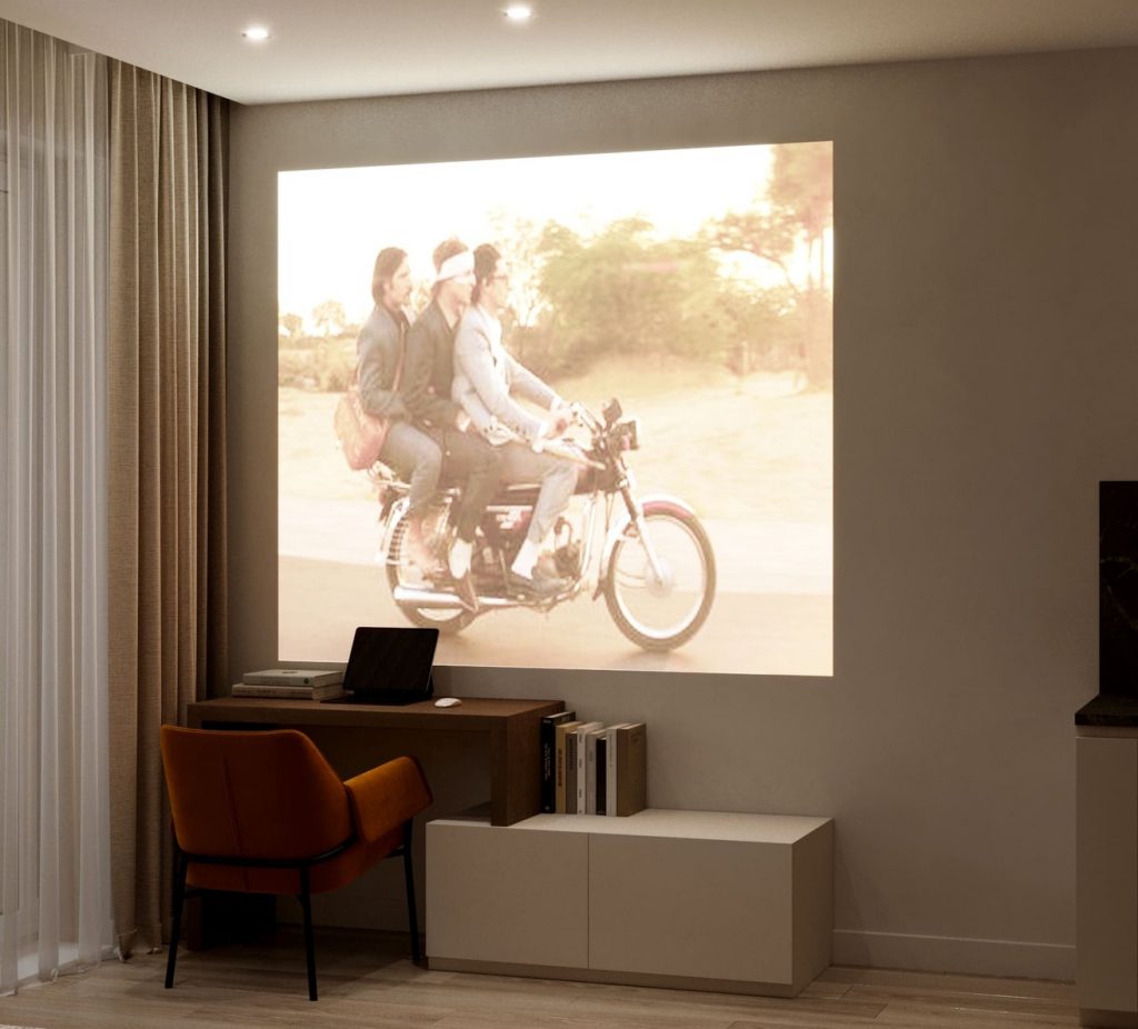 Благодаря тому, что вместо ТВ панели используется проектор и белая стена, нашлось место и для компактного рабочего места - компьютерного стола, укороченная ножка которого поставлена на ТВ тумбу для экономии пространства, и удобного акцентного кресла.