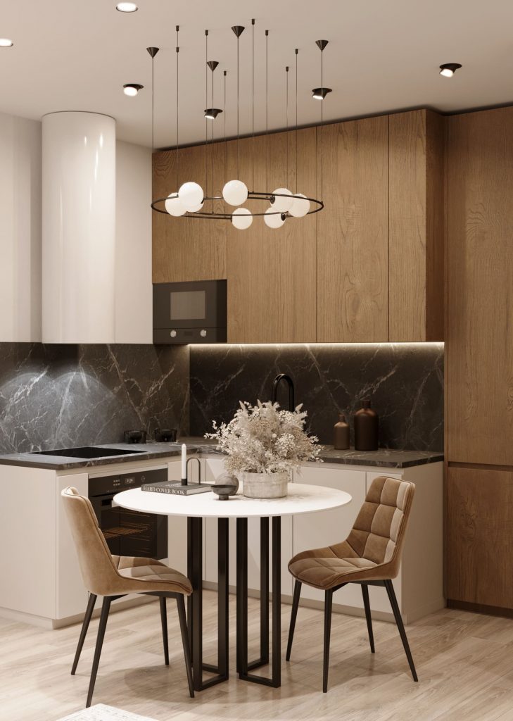 Угловая кухня, хоть и оборудована всем необходимым - встроенными плитой, СВЧ, посудомоечной машиной, раковиной, разделочными столами, холодильником, верхними шкафами, имеет только утилитарное назначение - минимальное пространство для редких эпизодов приготовления еды дома. А вот гостиная - основное место притяжения в квартире: глубокий мягкий диван и проектор создают настроение, чтобы вечером с удовольствием посмотреть любимый фильм одной или с друзьями. Также, к зоне гостиной относятся: маленький кофейный столик, подвесная полка для проектора и декоров, основательная напольная двухдверная ТВ тумба. Небольшая обеденная зона - эргономичный круглый стол и два кресла-стула.