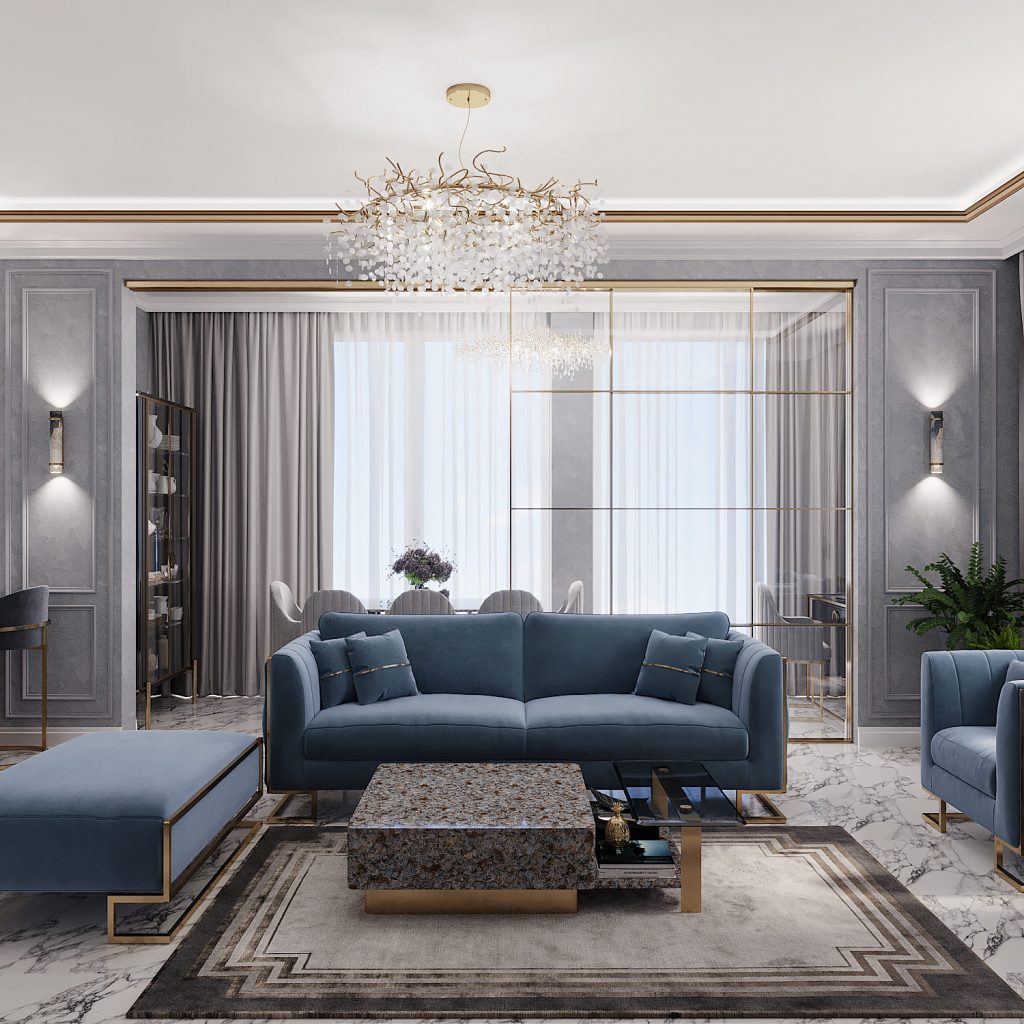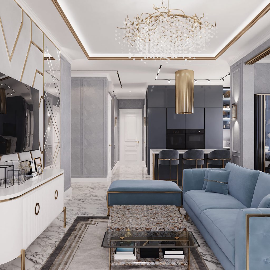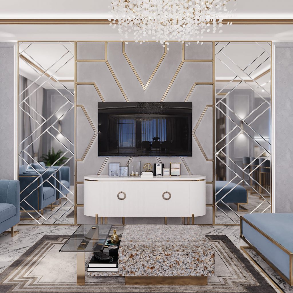 Гостиная — это про комфорт и стиль. Мягкие диваны в пыльно-голубом оттенке, зеркальные панели с геометрией, светильники с эффектом «ветвей» — всё работает на ощущение уюта и лёгкой элегантности. Центральная стена оформлена декоративными панелями с подсветкой и геометрическим рисунком в золоте — она сразу задаёт тон всей комнате.