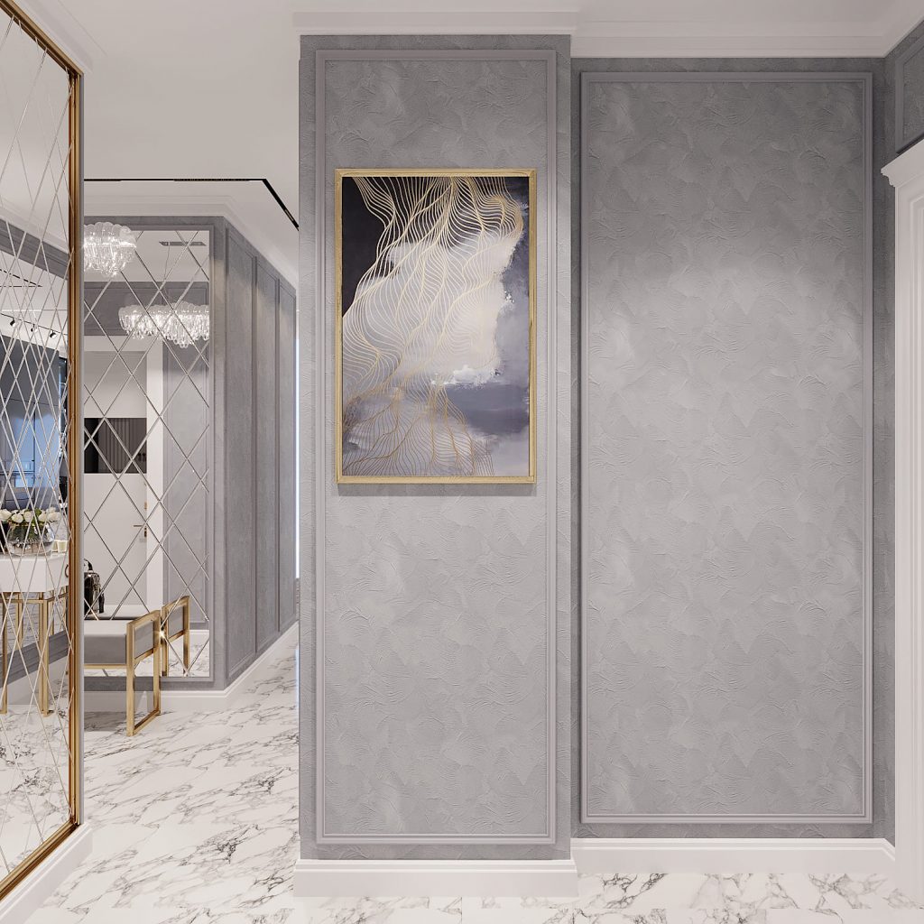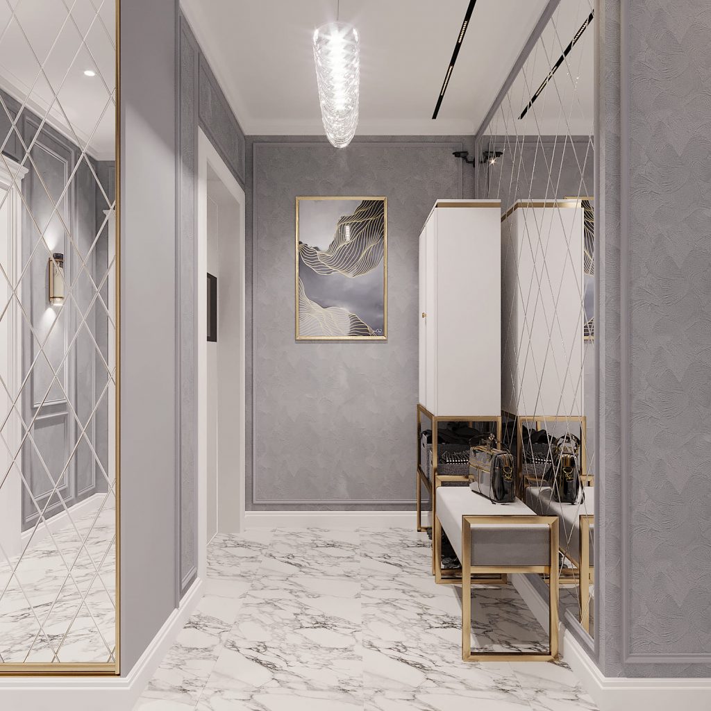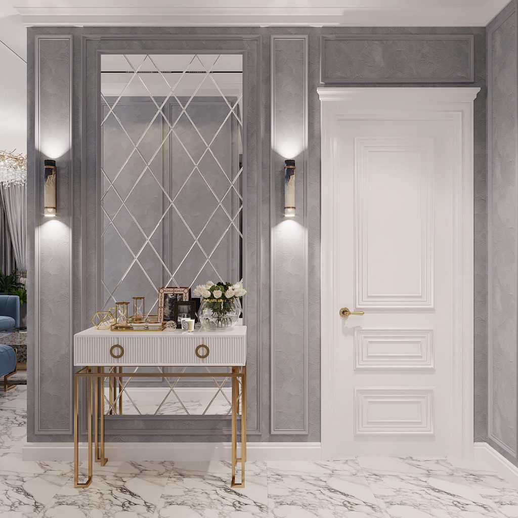 Просторная прихожая оформлена в серо-голубых тонах с золотыми акцентами и зеркалами в диагональной раскладке, которые зрительно расширяют пространство и добавляют интерьеру торжественности.