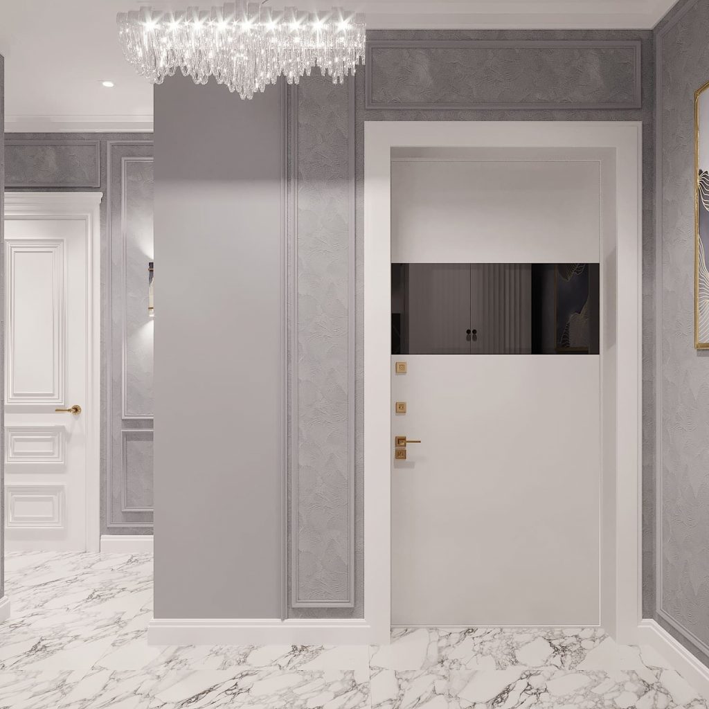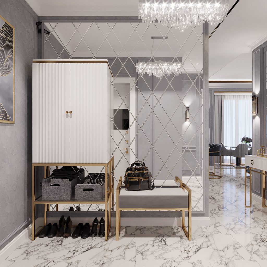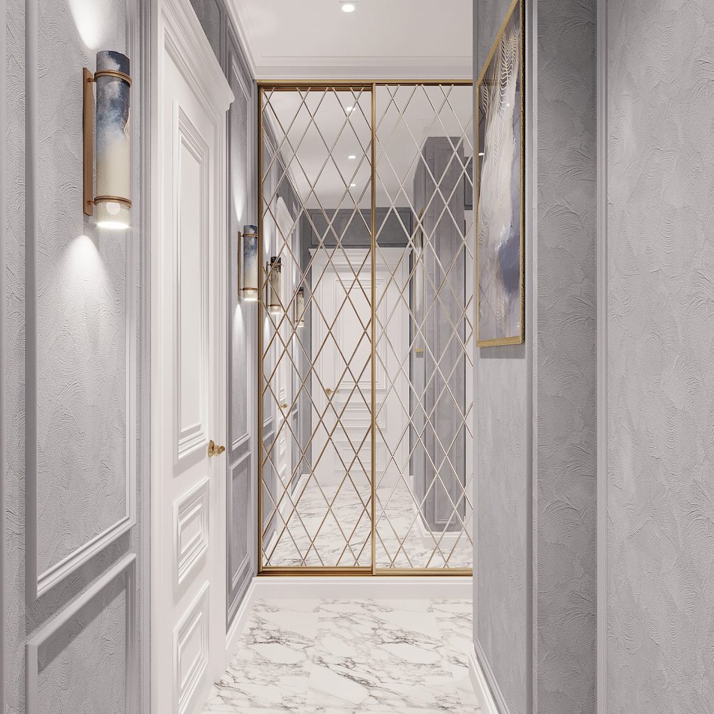 Просторная прихожая оформлена в серо-голубых тонах с золотыми акцентами и зеркалами в диагональной раскладке, которые зрительно расширяют пространство и добавляют интерьеру торжественности.