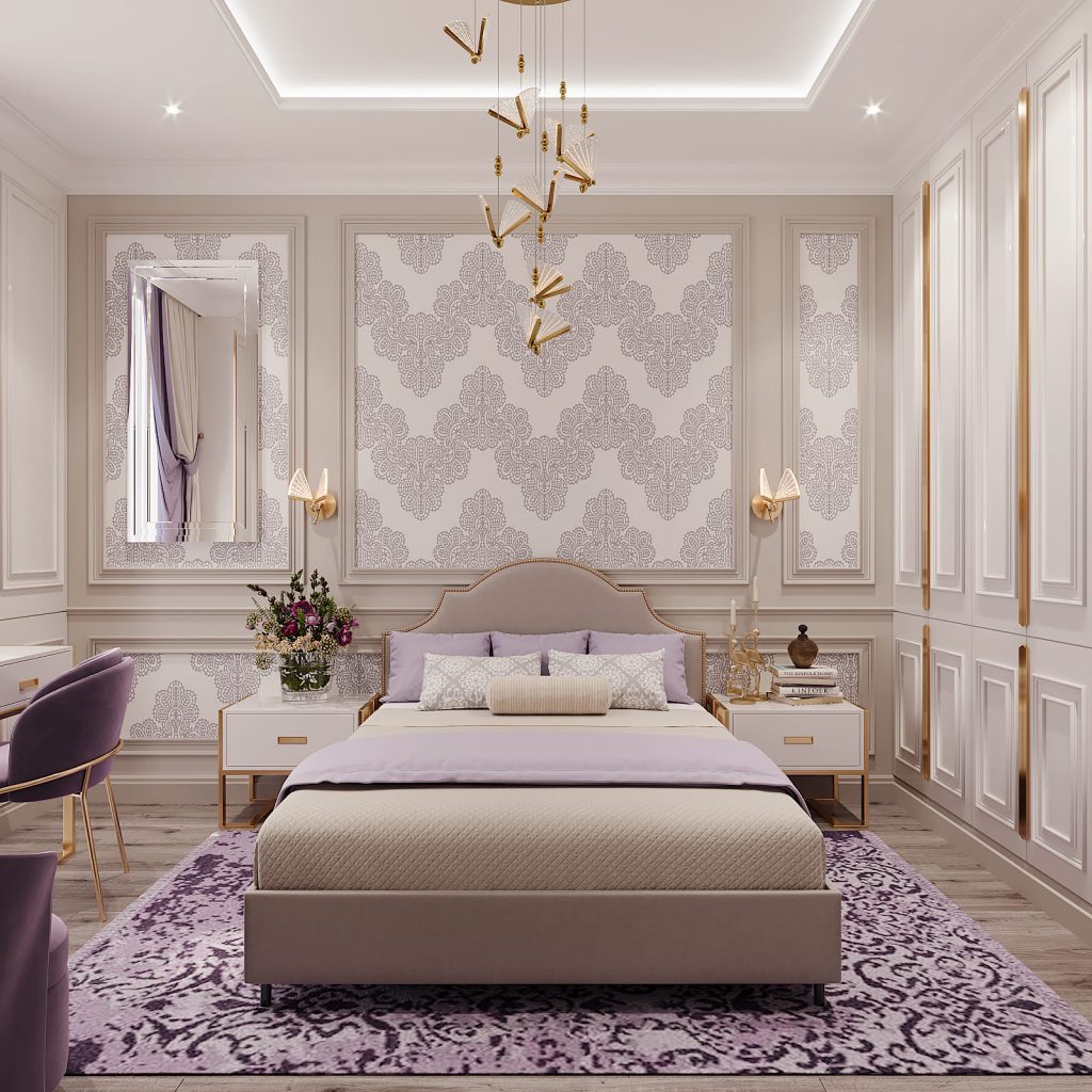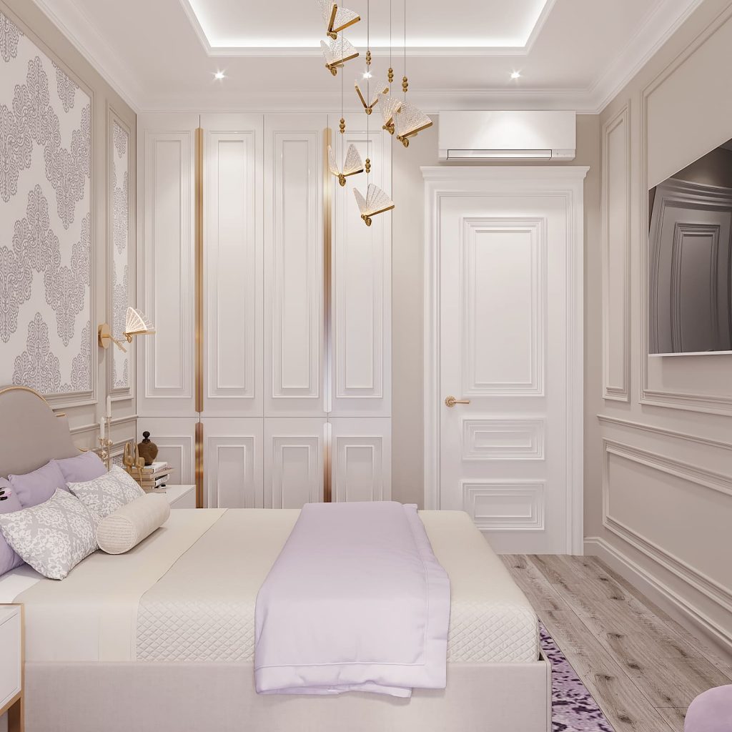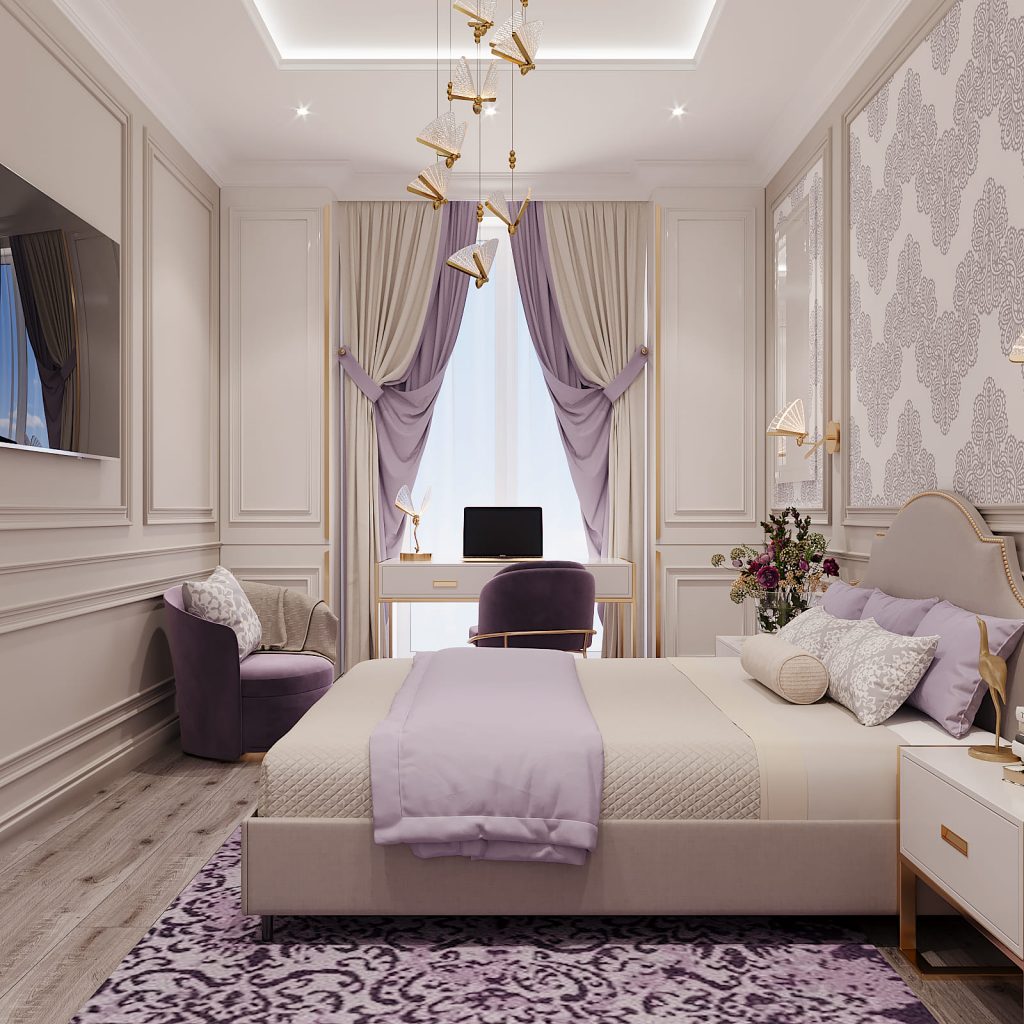 Эта комната словно создана для принцессы: в отделке — нежные оттенки лавандового, слоновой кости и золота, а в декоре — изящество и лёгкость. Пространство получилось гармоничным и утончённым, но не вычурным. Центральное место занимает мягкая кровать с изогнутым изголовьем и декоративными подушками. Над ней — текстильные панели с изящным орнаментом. Изюминка интерьера — подвесной светильник в виде парящих книг-бабочек, который добавляет фантазии и волшебства. Зона у окна — одновременно рабочая и вдохновляющая: письменный стол, удобное кресло и мягкий свет от окон, оформленных пышными драпировками. Здесь удобно и учиться, и мечтать.
