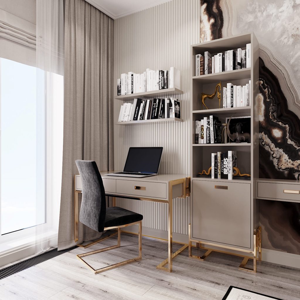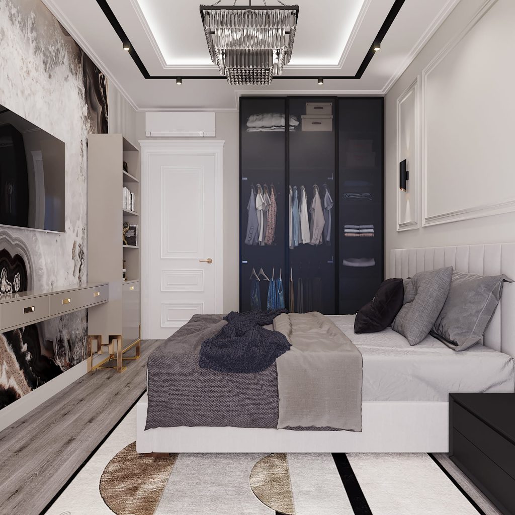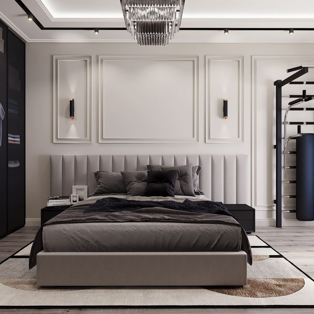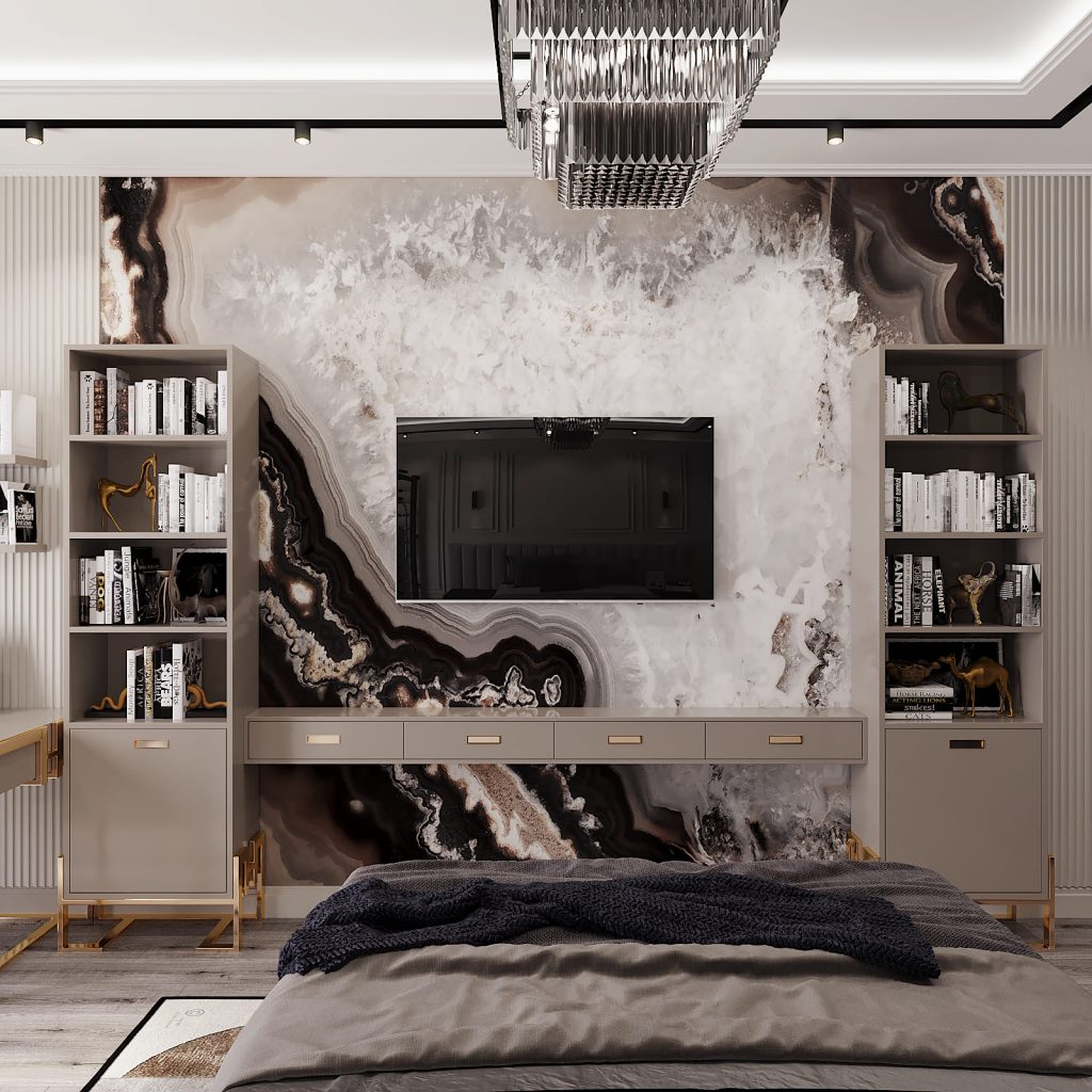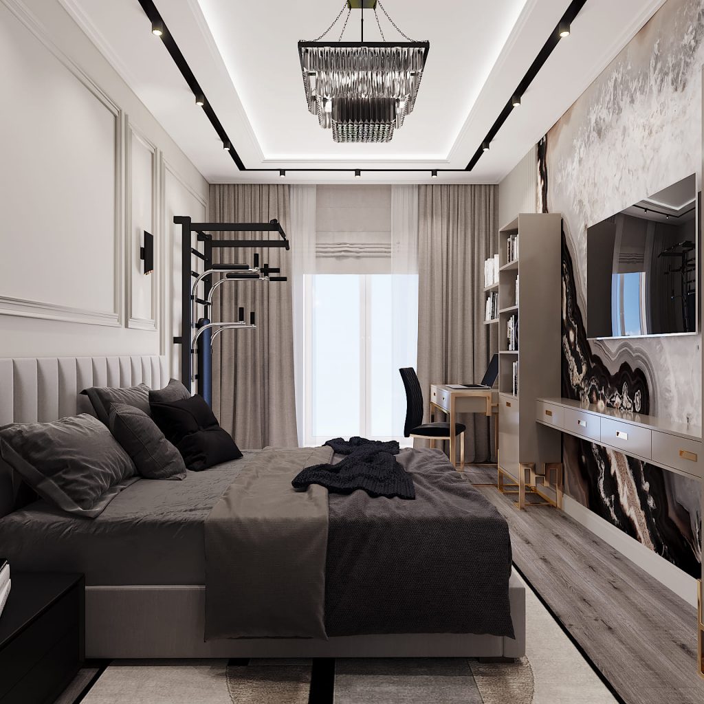 Интерьер выполнен в спокойной мужской палитре: графит, беж, тёплый серый и черный. Контрастная акцентная стена с агатовым узором задаёт динамику и сразу привлекает внимание. В комнате всё продумано для подростка или старшего школьника: полноценное рабочее место у окна, вместительная система хранения с затемнёнными фасадами и даже спортивный уголок с турником. Кровать с высоким мягким изголовьем делает зону отдыха визуально уютной, а чёткая геометрия мебели и потолочного освещения поддерживает общий ритм интерьера.