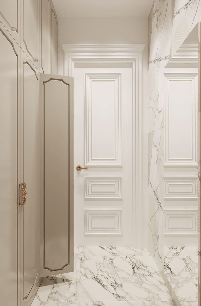 и бежевых тонов, изящными молдингами и фурнитурой с теплым металлическим отливом с прихожей