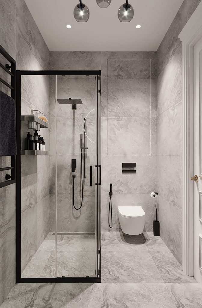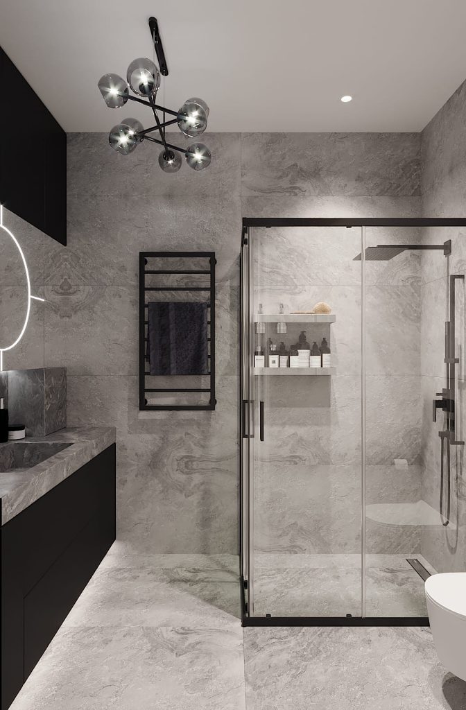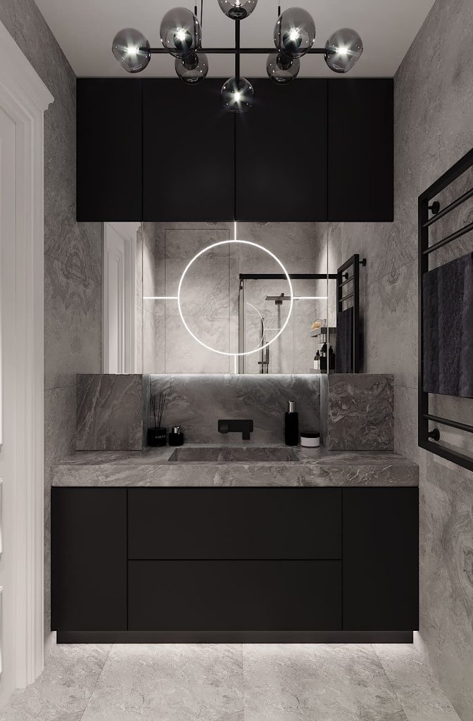 В отделке использован камень с выразительной текстурой серого оттенка, подчёркнутый чёрной сантехникой и геометрией форм. Акцент — на сдержанную роскошь и максимальный порядок. Пространство организовано рационально: компактная душевая кабина с тропическим душем, подвесной унитаз и вместительная тумба с умывальником в едином каменном исполнении. Глубокий матовый чёрный фасад мебели и светящееся круглое зеркало создают игру света и делают интерьер визуально цельным.