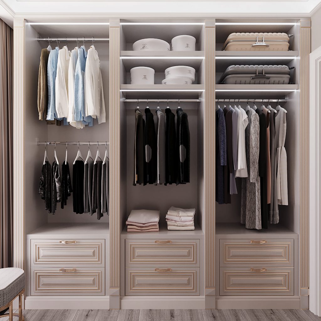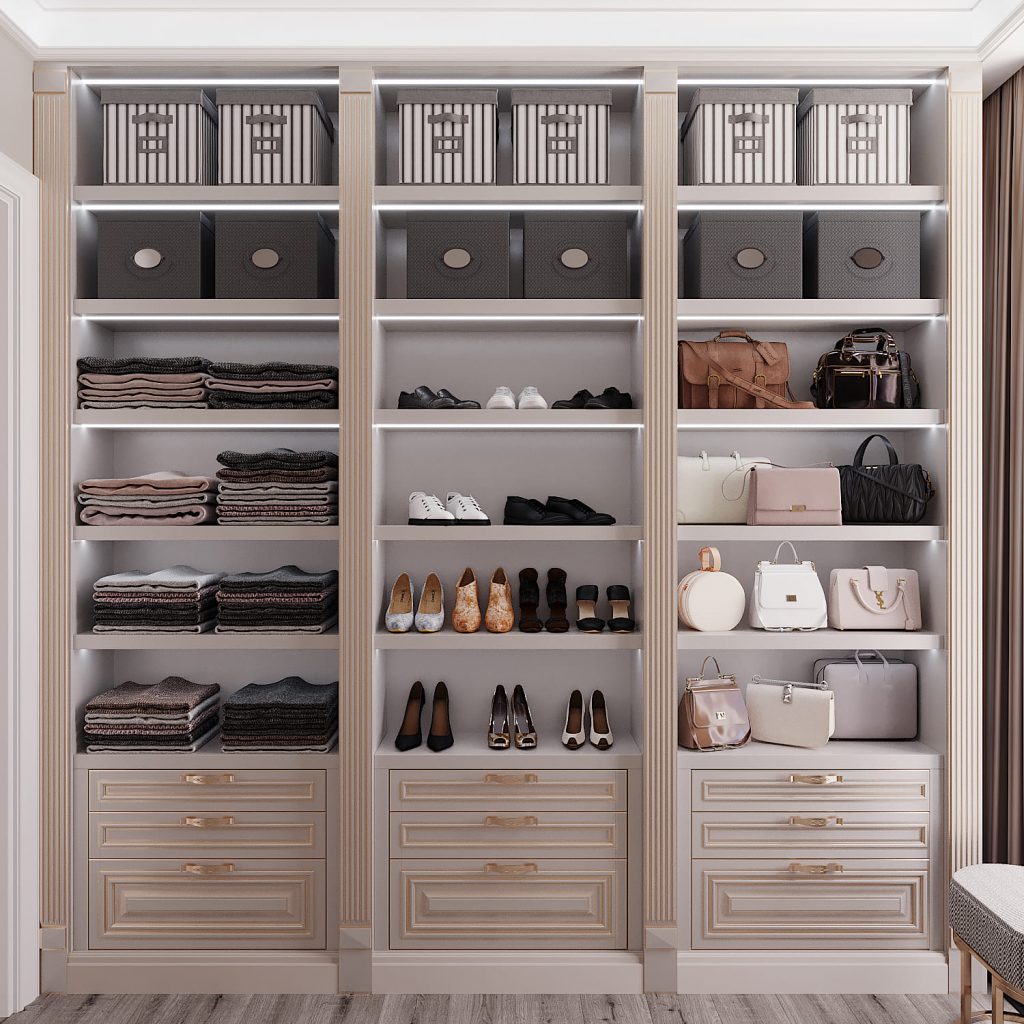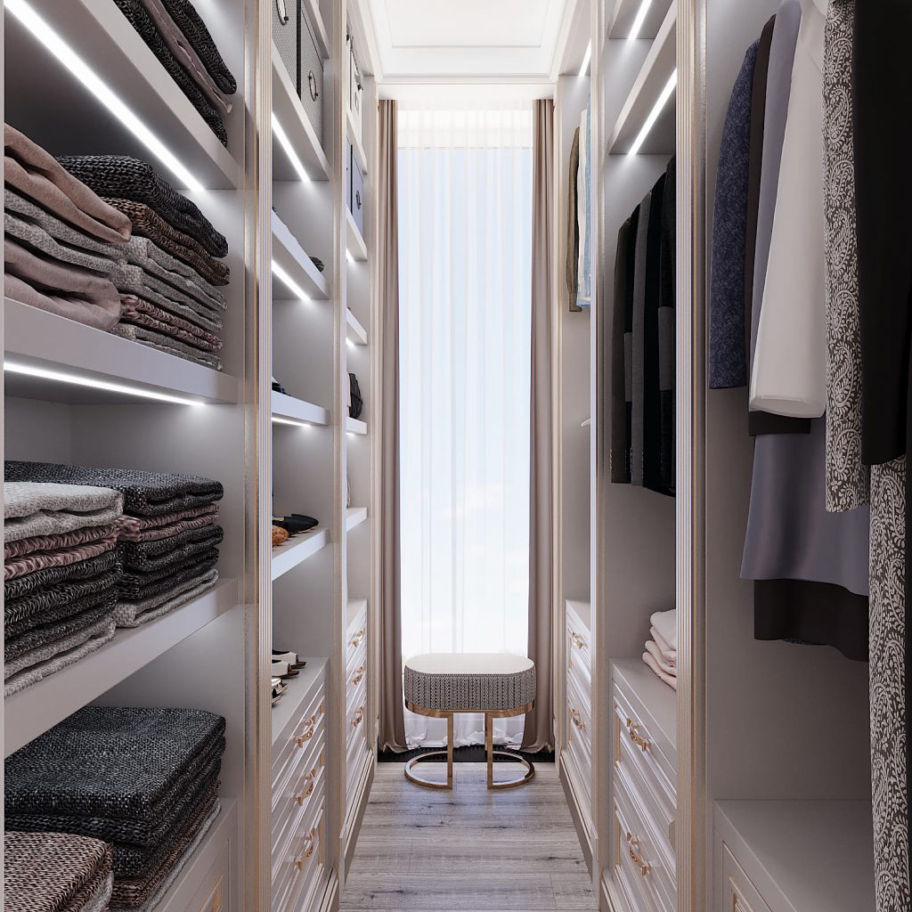 Функциональная и эстетичная гардеробная выполнена в светлой цветовой гамме с акцентом на фактурные фасады и мягкое освещение. Множество систем хранения: от выдвижных ящиков до открытых полок и секций под сумки и обувь — всё организовано для удобства и порядка. Подсветка в нишах делает пространство не только визуально легче, но и практичнее. В конце прохода — мягкий пуф у окна, который добавляет уюта и завершённости этой зоне.