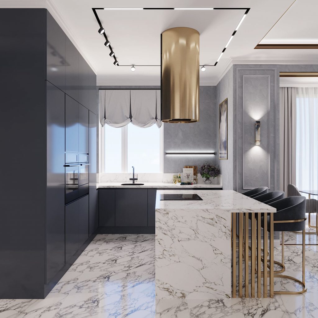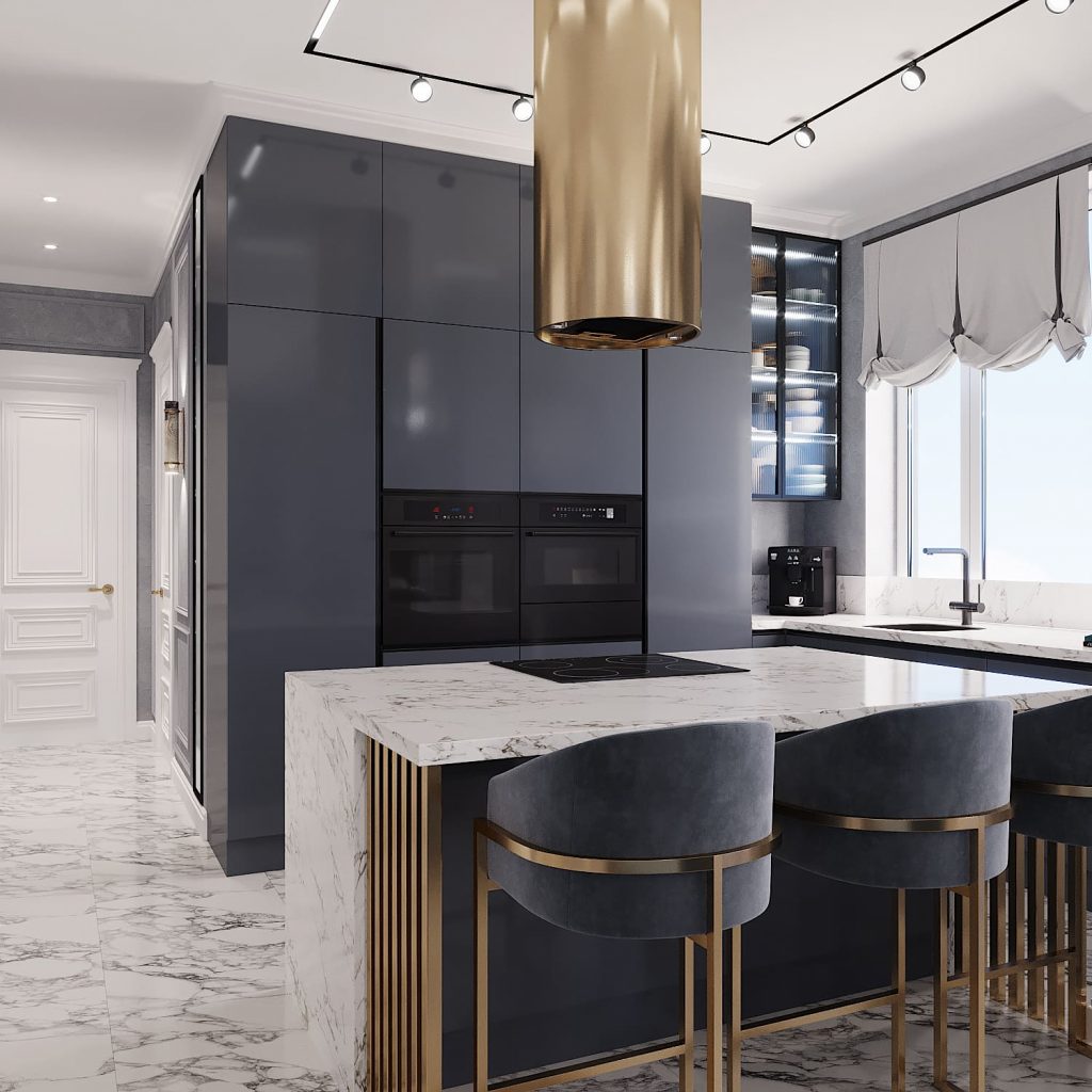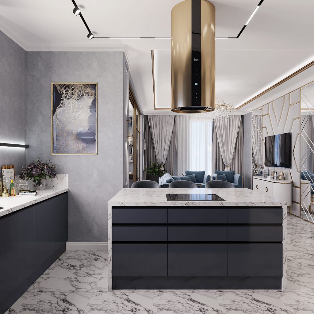 Кухонная зона расположена строго по мокрой зоне — вдоль окна. Гарнитур выполнен в насыщенном графитовом цвете с глянцевыми фасадами, а остров, отделяющий её от гостиной, стал и рабочей поверхностью, и местом для быстрых завтраков. Над островом — акцентная цилиндрическая вытяжка в золотистом металле, поддерживающая общее настроение интерьера.