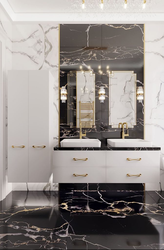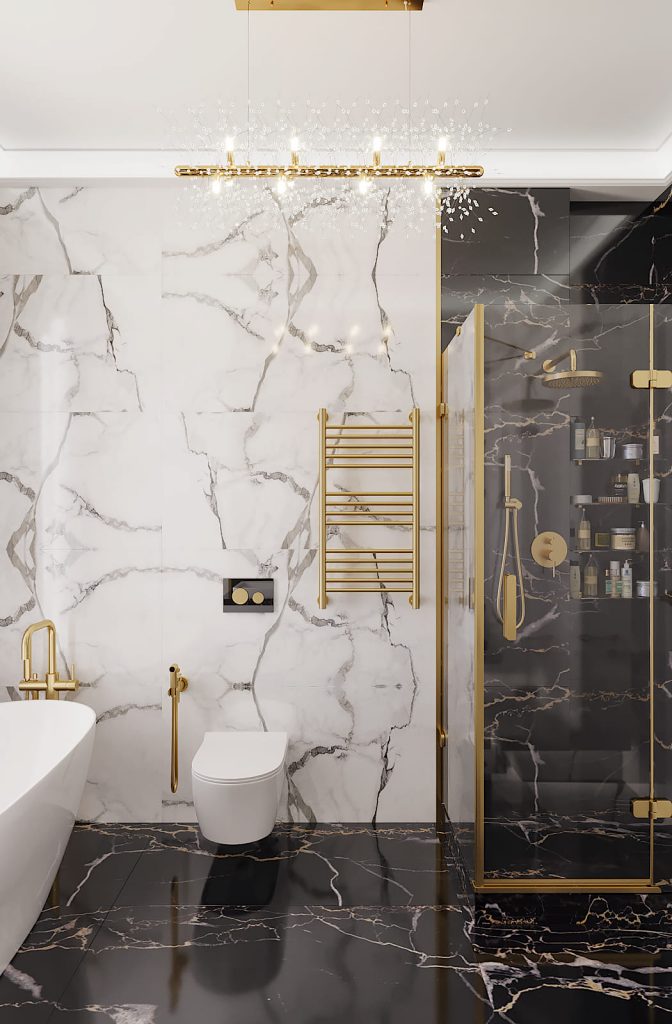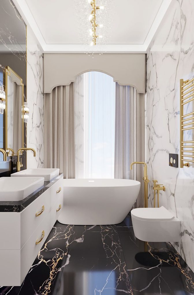 Контраст чёрного и белого мрамора с золотыми акцентами создаёт эффект дорогого бутик-отеля. Здесь каждая деталь работает на стиль: от изящных светильников и смесителей цвета шампань до двойной раковины на чёрной столешнице с зеркальным фоном. Свободно стоящая ванна расположена у окна, оформленного декоративной аркой и мягкими портьерами, — идеальное место для расслабления. Напротив — просторный душ с золотой фурнитурой и стеклянной перегородкой. Несмотря на премиальный внешний вид, интерьер продуман и с практической стороны: достаточно мест для хранения, качественная сантехника и разумное зонирование.