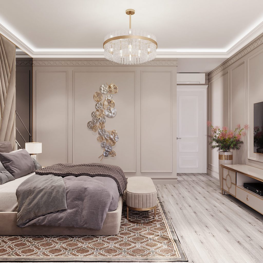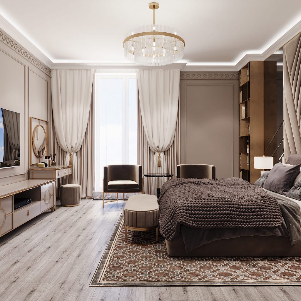 Интерьер родительской спальни получился одновременно сдержанным и утончённым. В отделке мы использовали тёплые нюдовые оттенки, глубокий шоколад и благородные золотые акценты. Центральный элемент — высокое изголовье с графичным текстилем, которое визуально зонирует пространство и создаёт ощущение защищённости. Мягкий текстиль, кресла у окна, туалетный столик и уютная банкетка у кровати — всё здесь работает на комфорт и эстетику. Декор лаконичен, но продуман: лепной карниз, встроенные световые линии, изящная люстра и акцентное панно на стене создают завершённый образ.