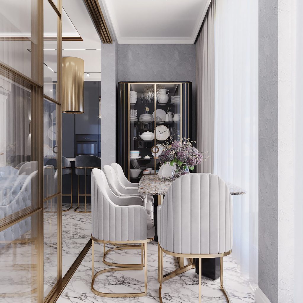 Обеденную зону мы вынесли на утеплённую лоджию, не присоединяя её к квартире. За раздвижной перегородкой с золотым каркасом разместился большой стол и витрина для посуды — отдельное пространство для неспешных ужинов и приёма гостей.