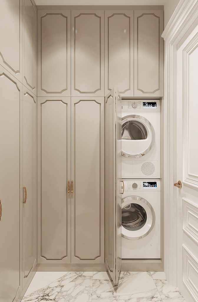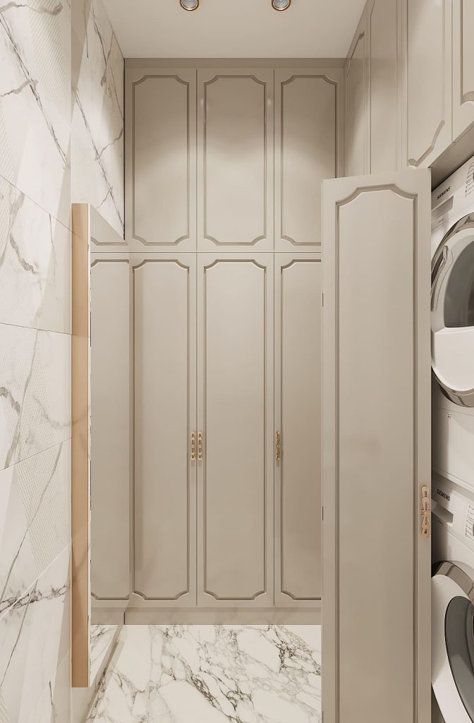 Кладовая-постирочная выполнена в спокойных бежевых тонах с классическими фасадами и элегантной фурнитурой. Встроенные шкафы до потолка скрывают все необходимое: стиральную и сушильную машины, хозяйственный инвентарь, бытовую химию и текстиль. Каждый сантиметр пространства задействован с умом — даже за распашными дверцами скрыты дополнительные зоны хранения. Пол и часть стен отделаны керамогранитом с выразительным мраморным рисунком, что придаёт помещению не только декоративность, но и практичность — всё легко моется и выглядит опрятно.