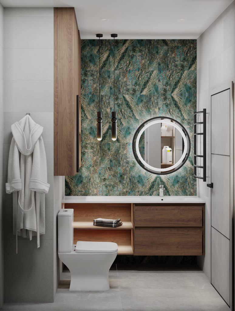 Основное освещение ванной обеспечивают точечные светильники, дополнительное - подсветка зеркала и подвесные светильники над тумбой. В ванной в качестве акцента выбрали плитку с изумрудным оттенком, который перекликается с акцентами в других комнатах.