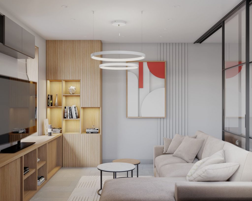 Апартаменты в стиле контемпорари с акцентами, вдохновленными видом из окна на стадион: спокойные серые тона с красными деталями и арт-объектами
