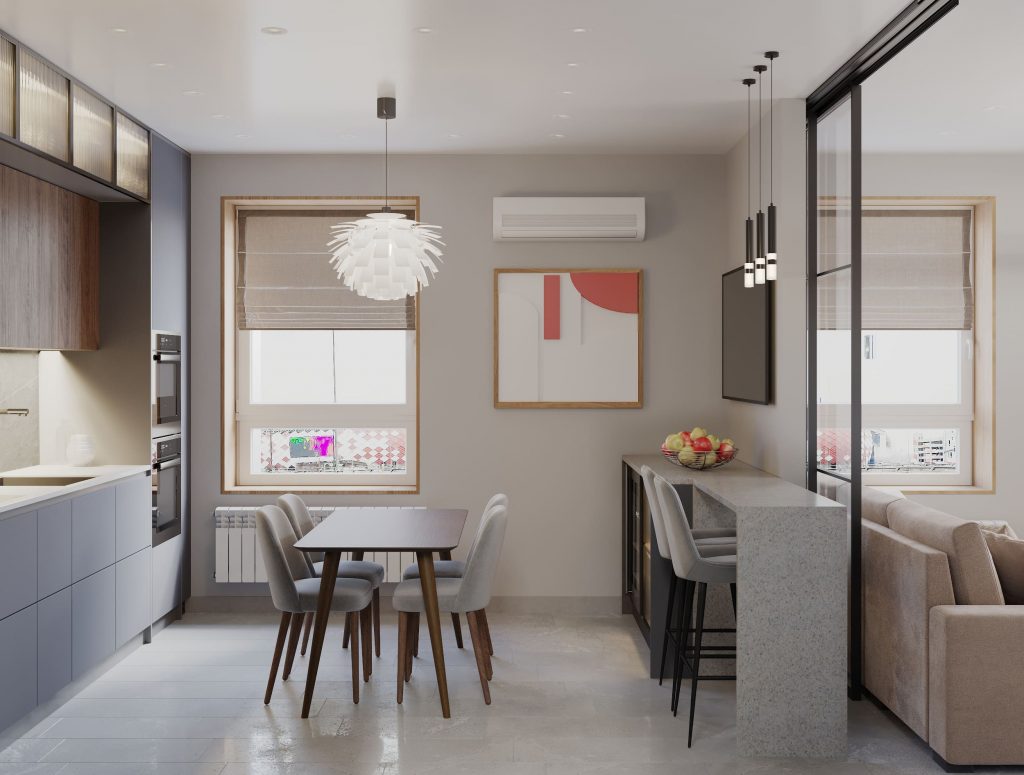 Кухня-гостиная делится две основные функциональные зоны - собственно, кухни и гостиной, которые отделены друг от друга стеной с встроенной раздвижной перегородкой, закрепленной на профилях-рельсах.