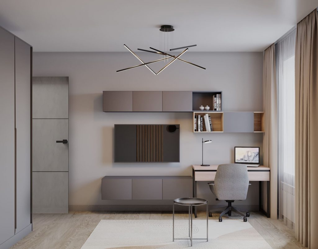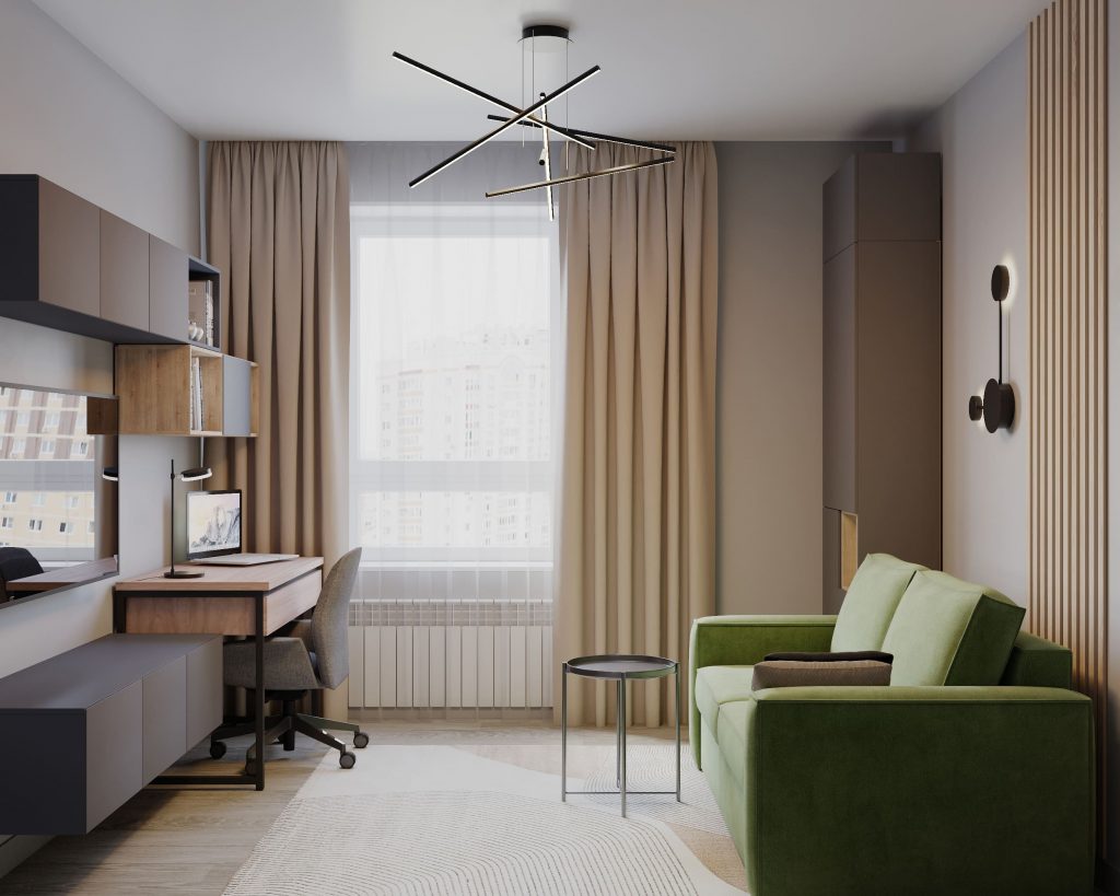 Детская-кабинет оформлена ненавязчиво и неброско, так как подразумевает использование на все случаи жизни и под разные сценарии (комната мальчика или девочки, или кабинет). Она включает три зоны - отдыха, рабочего места и систему хранения.