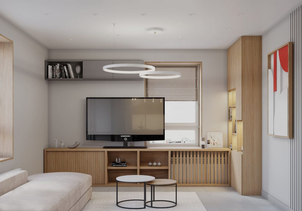 Гостиная включает зоны отдыха и хранения. Первая содержит удобный угловой диван со сдвоенным кофейным столиком, большую ТВ панель на подставке и деревянную тумбу под нее с открытыми полками, находящуюся под столешницей, что служит продолжением подоконника во всю стену, под которым также размещены деревянные экраны, маскирующие батареи отопления. Система хранения - это деревянный шкаф с полками-нишами для книг и декоров и подвесная книжная полка с открытыми и закрытыми секциями (над ТВ панелью).