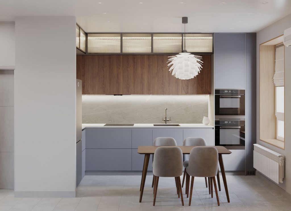 Кухня, в свою очередь включает: кухню-нишу, обеденную зону, зону барной стойки. Кухня-ниша содержит все необходимое - встроенные холодильник, плиту, мойку, духовой шкаф с СВЧ, нижние модули со столешницей для разделки продуктов, верхние шкафы для хранения, дополнительный ряд секций с дверками с рифленым стеклом для праздничной посуды. Обеденная зона представлена вместительным эргономичным столом со скругленными краями с четырьмя комфортными стульями-креслами. Под столешницей барной стойкой справа - пространство для ног (открытая часть), а с левой - винный шкаф и витрина с полками для напитков и хрустальной посуды с стеклянными дверцами. Дополнена барная стойка удобными барными стульями. Также, над барной стойкой размещена ТВ панель, чтобы можно было развлечь себя любимыми программами во время приготовления пищи или обеда/ужина.
