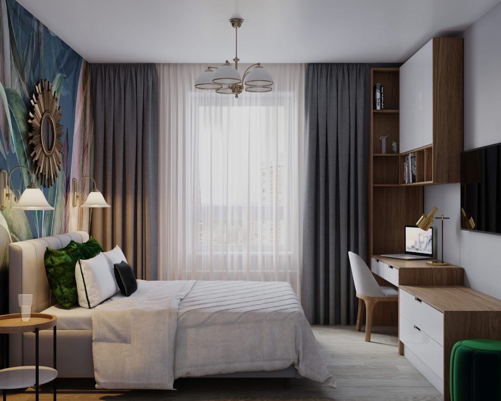 В спальне несколько функциональных зон - отдыха, рабочего места, хранения и бьюти. Первая включает удобную кровать с круглыми прикроватными столиками с нижними функциональными полочками, подвесную ТВ-панель и ТВ-тумбу с двумя вместительными отделениями с выдвижными ящиками. Рабочее место представлено подвесным компьютерным столом в таком же стиле, как ТВ панель с двумя выдвижными ящиками, в которые можно положить канцелярские принадлежности, и удобным стулом к нему. Система хранения - большой деревянный гардеробный шкаф и вертикальный и горизонтальный деревянные модули с полками для книг над компьютерными столом. Бьюти зона включает большое зеркало почти до потолка с удобным компактным пуфиком.