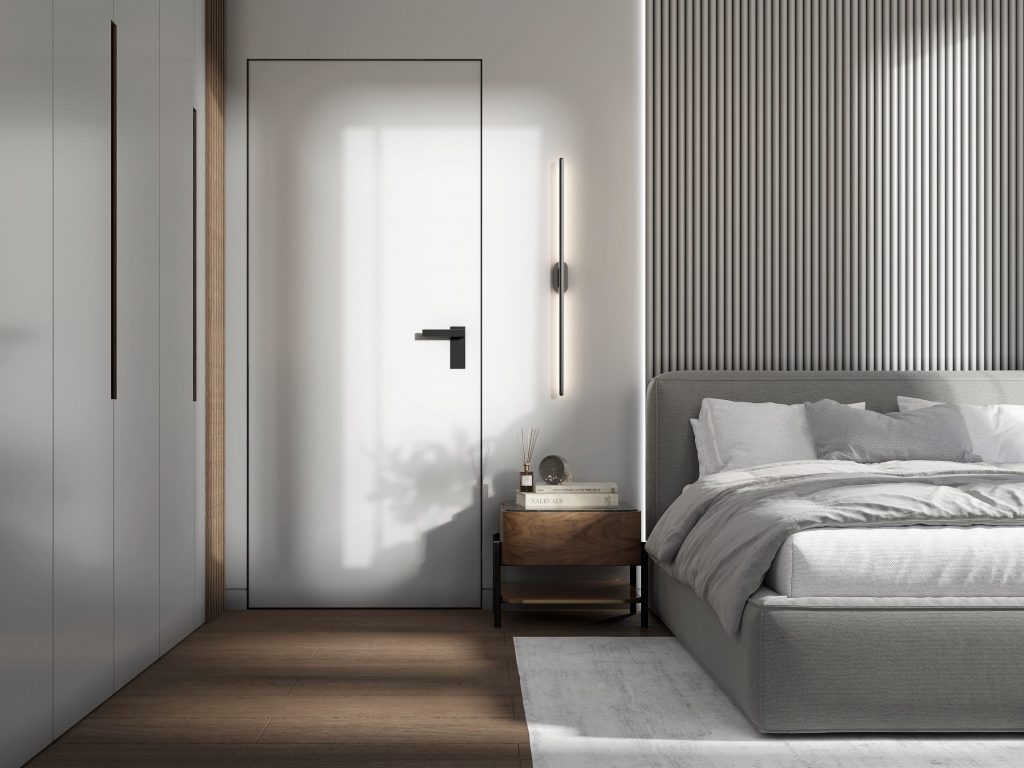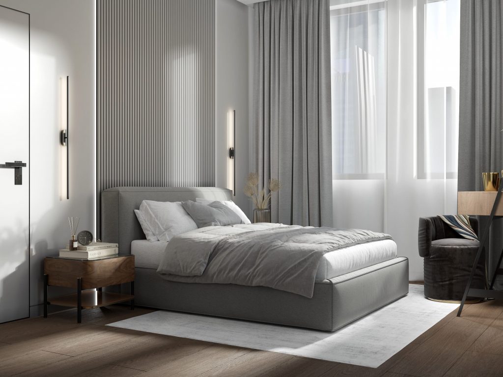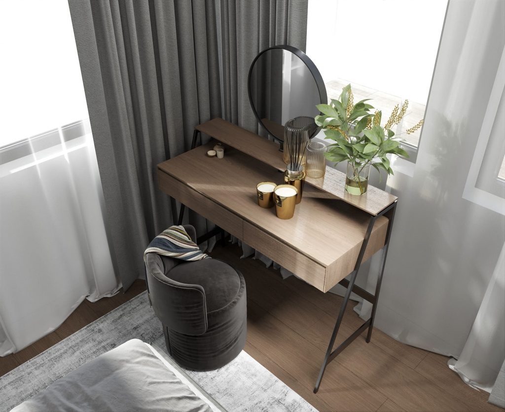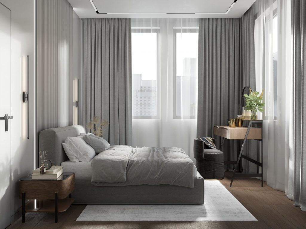Небольшая спальня оформлена оптимально функционально и минималистично. Здесь только удобная кровать с двумя прикроватными компактными столиками с нижним функциональным отделением, большой гардеробный шкаф, комфортная бьюти-зона со столиком-консолью с выдвижными секциями и встроенным зеркалом, и удобным креслом-пуфом. Освещается комната в дневное время через большие окна, в вечернее - подсветкой потолка, дополнительно - минималистичными бра над прикроватными столиками и от подсветки стеновой панели за кроватью.