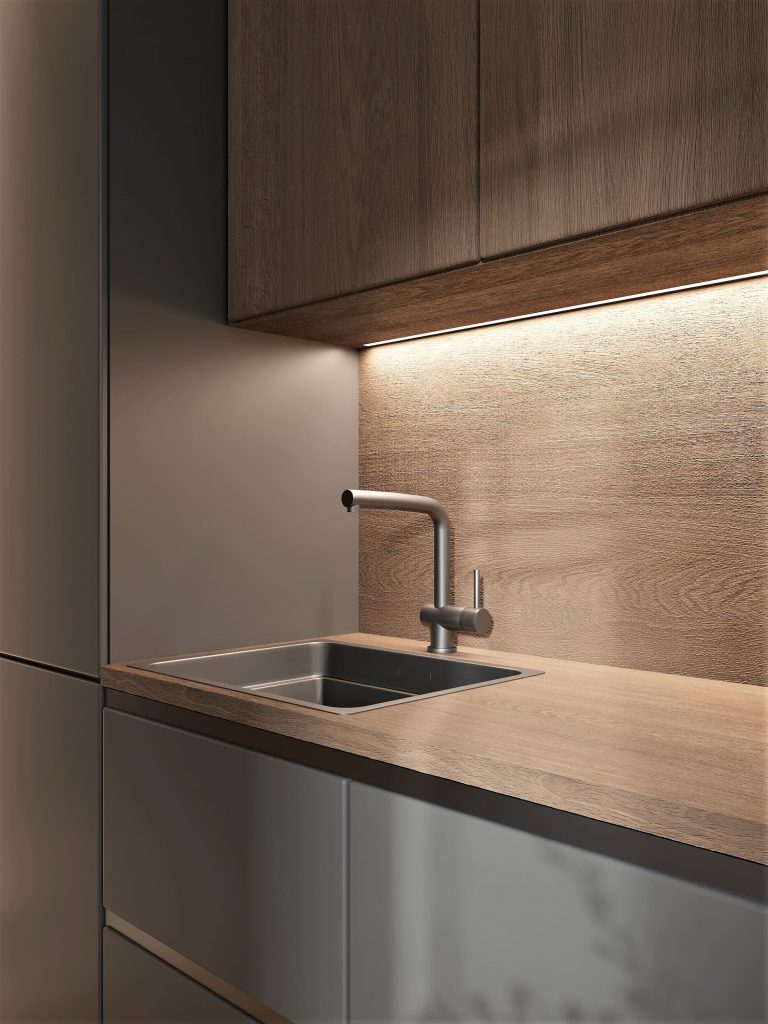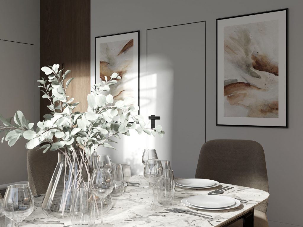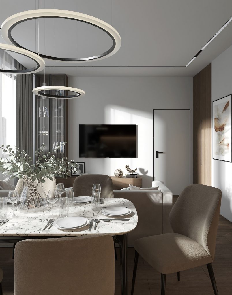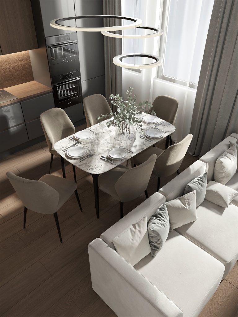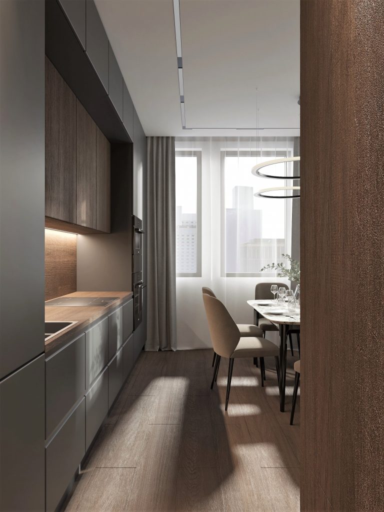 Кухонная зона представляет собой линейную, встроенную во всю стену кухню-нишу в минималистичном стиле, которая оснащена всем необходимым - холодильником, мойкой, плитой, духовым шкафом с СВЧ, нижними модулями со столешницей, верхними и антресольными модулями. Обеденная зона - это эргономичный вместительный стол прямоугольной формы со скругленными краями с шестью удобными мягкими стульями. Зона отдыха включает вместительный угловой диван с ТВ панелью и компактной подвесной ТВ тумбой с тремя закрытыми секциями, на которую поставлен небольшой шкаф под книги и сувениры с двумя отделениями и полками со стеклянными дверцами - он представляет собой компактную систему хранения кухни-гостиной.