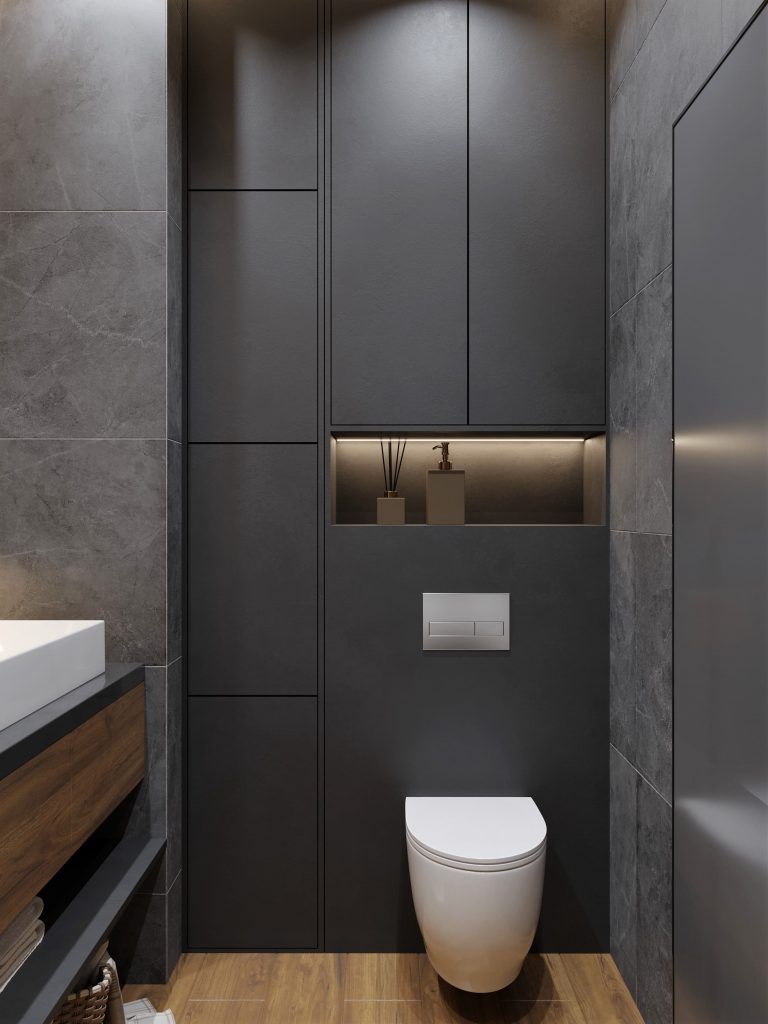 Основное освещение помещения осуществляет подсветка потолка, дополнительное - подсветка зеркала и подсветка ниши-полки над унитазом.