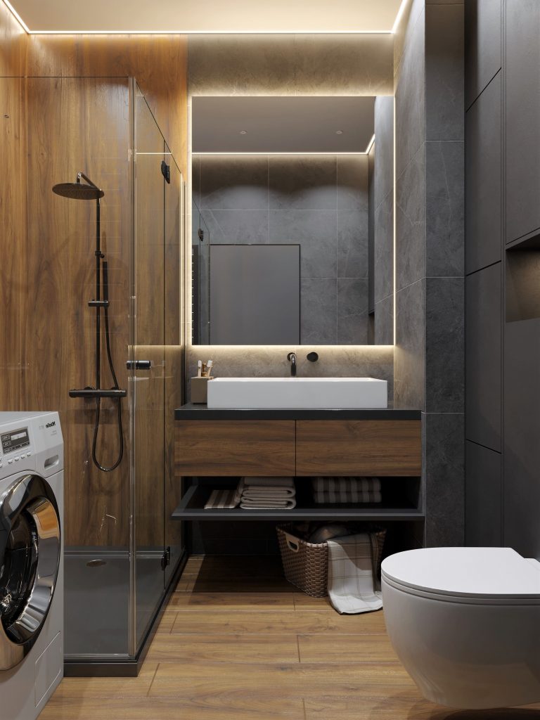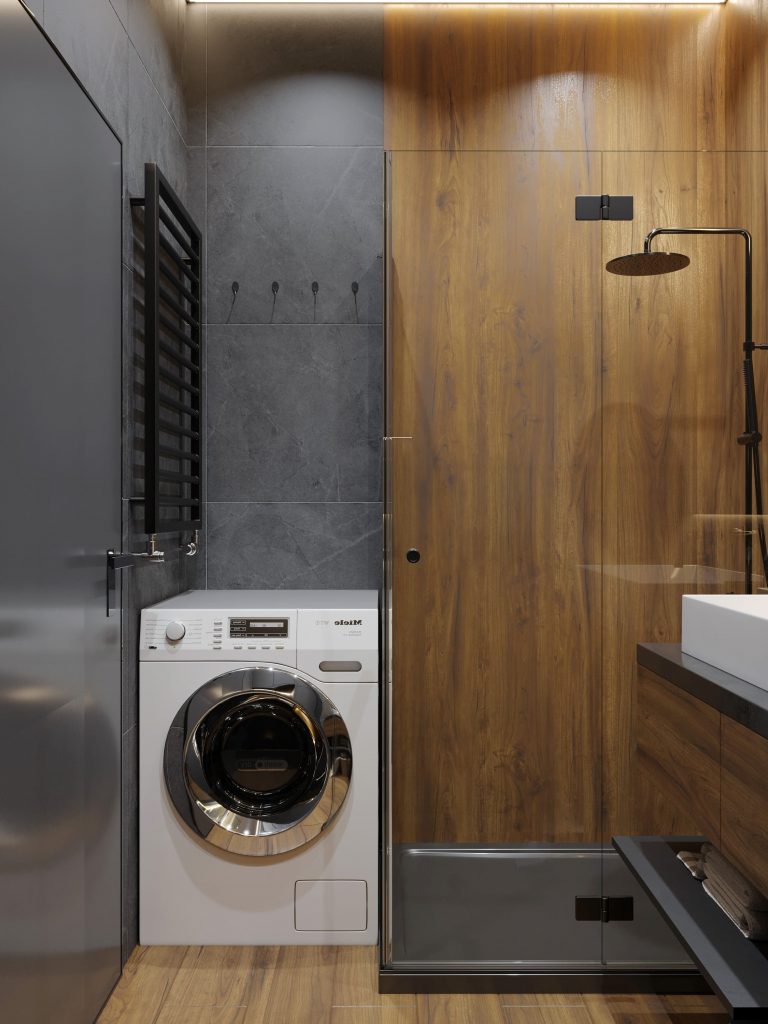 В компактной душевой размещен лишь строго необходимый функционал - минималистичная душевая; унитаз; раковина с узкой тумбой с двумя выдвижными секциями, под ней - подвесная полка для полотенец, над мойкой - большое зеркало до потолка, создающее эффект двойного пространства; подвесной полотенцесушитель и несколько крючков для банных халатов. Над унитазом имеется встроенная полка-ниша, на которую можно поставить ароматизаторы, жидкое мыло, освежители. По просьбе заказчицы мы добавили в душевую стиральную машину, эргономично разместив ее между душевой и стеной с входной дверью.