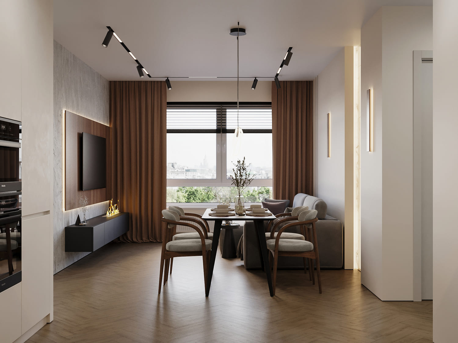 Столовая зона выделена современным деревянным столом и креслами с мягкой обивкой. Над столом — дизайнерский светильник с плавной линией, создающий ощущение динамики и добавляющий мягкого рассеянного света для ужинов и встреч с друзьями.