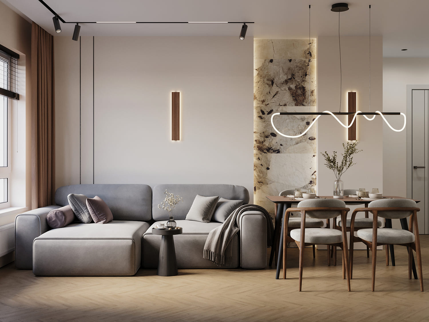 Современная квартира для молодой пары с акцентными фактурами — от камня до текстиля