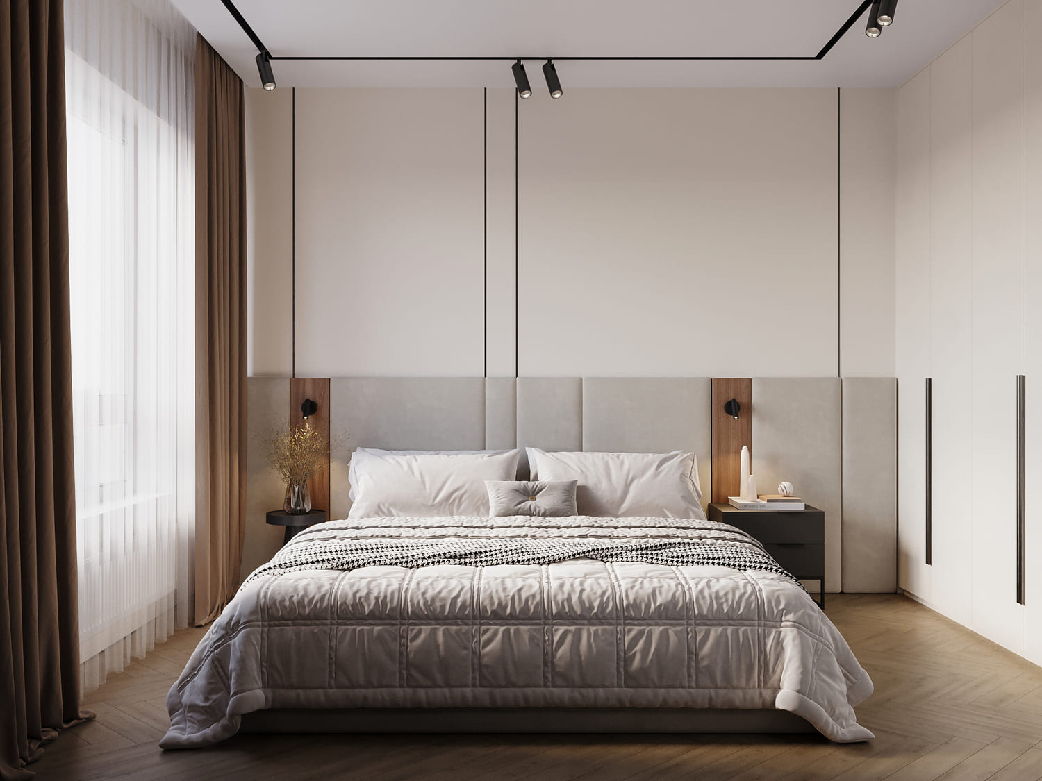 Интерьер спальни выдержан в спокойных светло-бежевых и тёплых коричневых тонах, которые помогают настроиться на отдых. Центром композиции стала мягкая панель за изголовьем кровати — она зонирует пространство и добавляет ощущение уюта. Вставки из дерева поддерживают тему природных материалов, создавая гармоничный ритм.